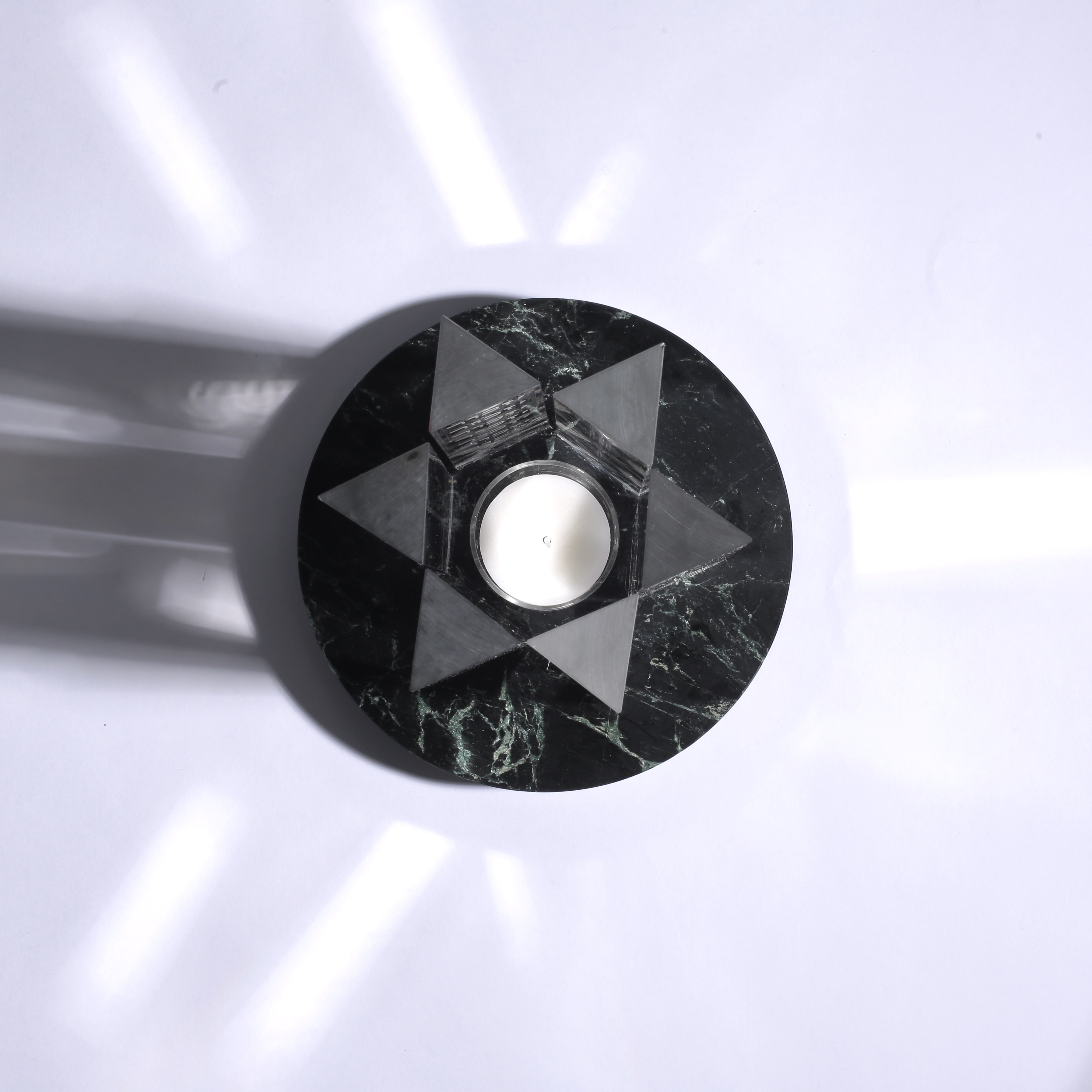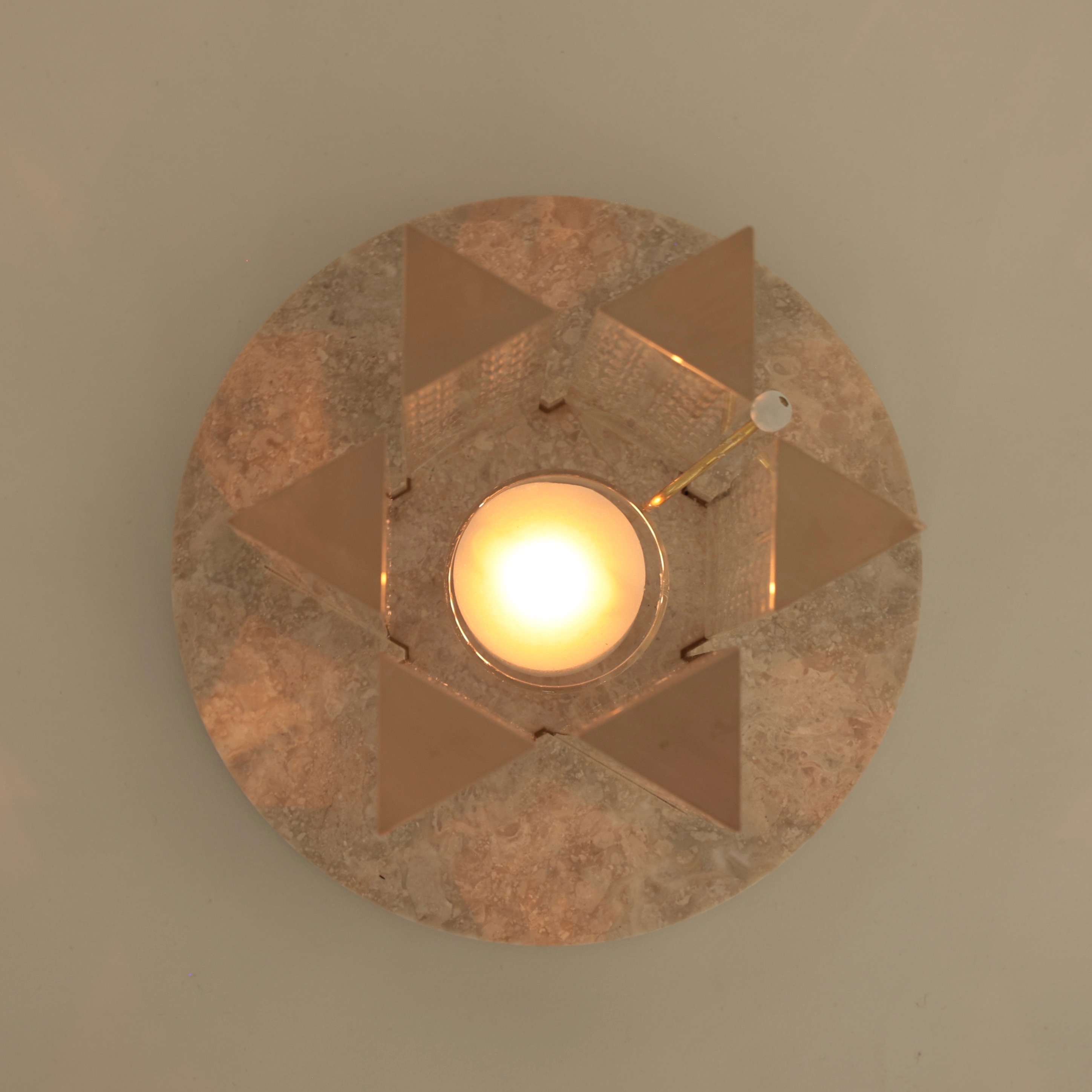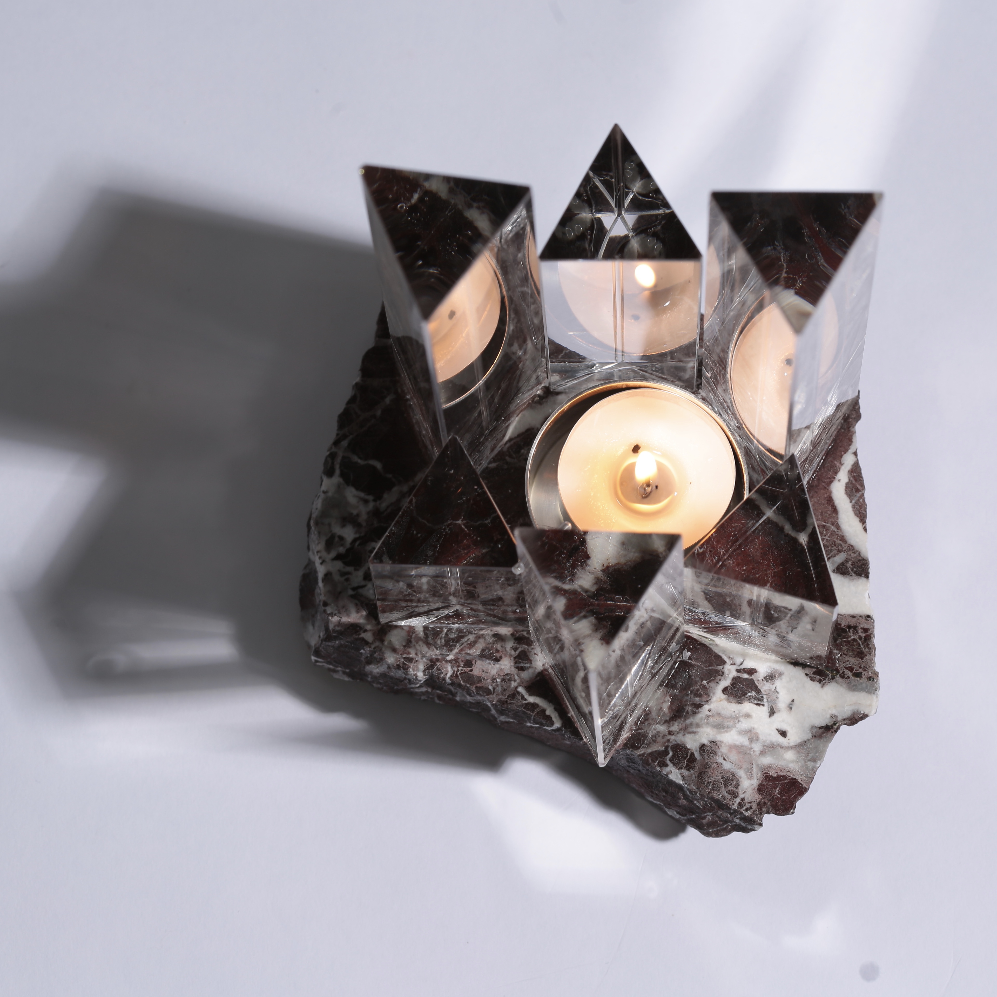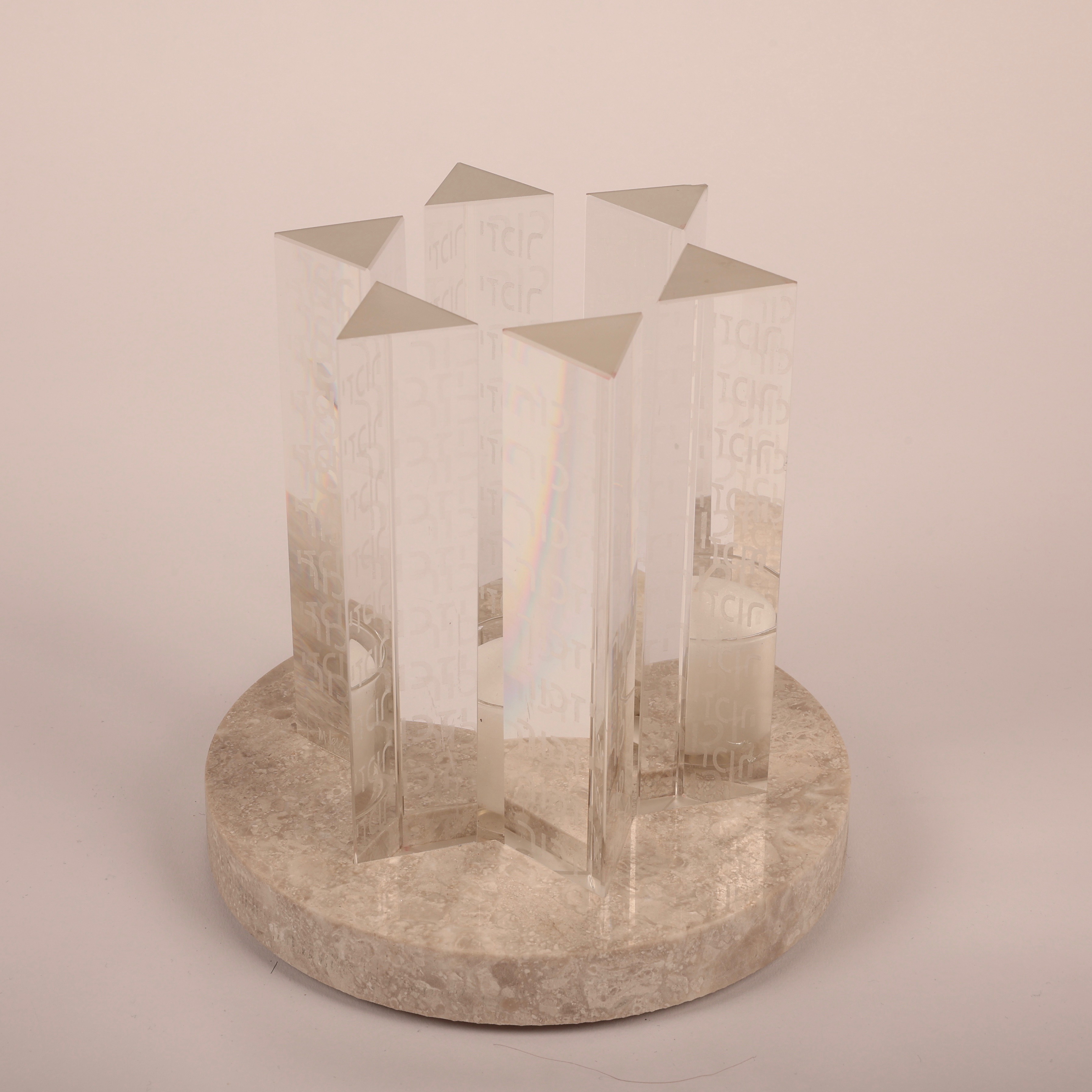 A more contemporary version of the large prism design incorporating a modern engraved motif. The Prisms are in crystal glass and sit on a heavy polished Travertine base. The plan form of the design is a Star of David. A removable glass pan houses the candle.