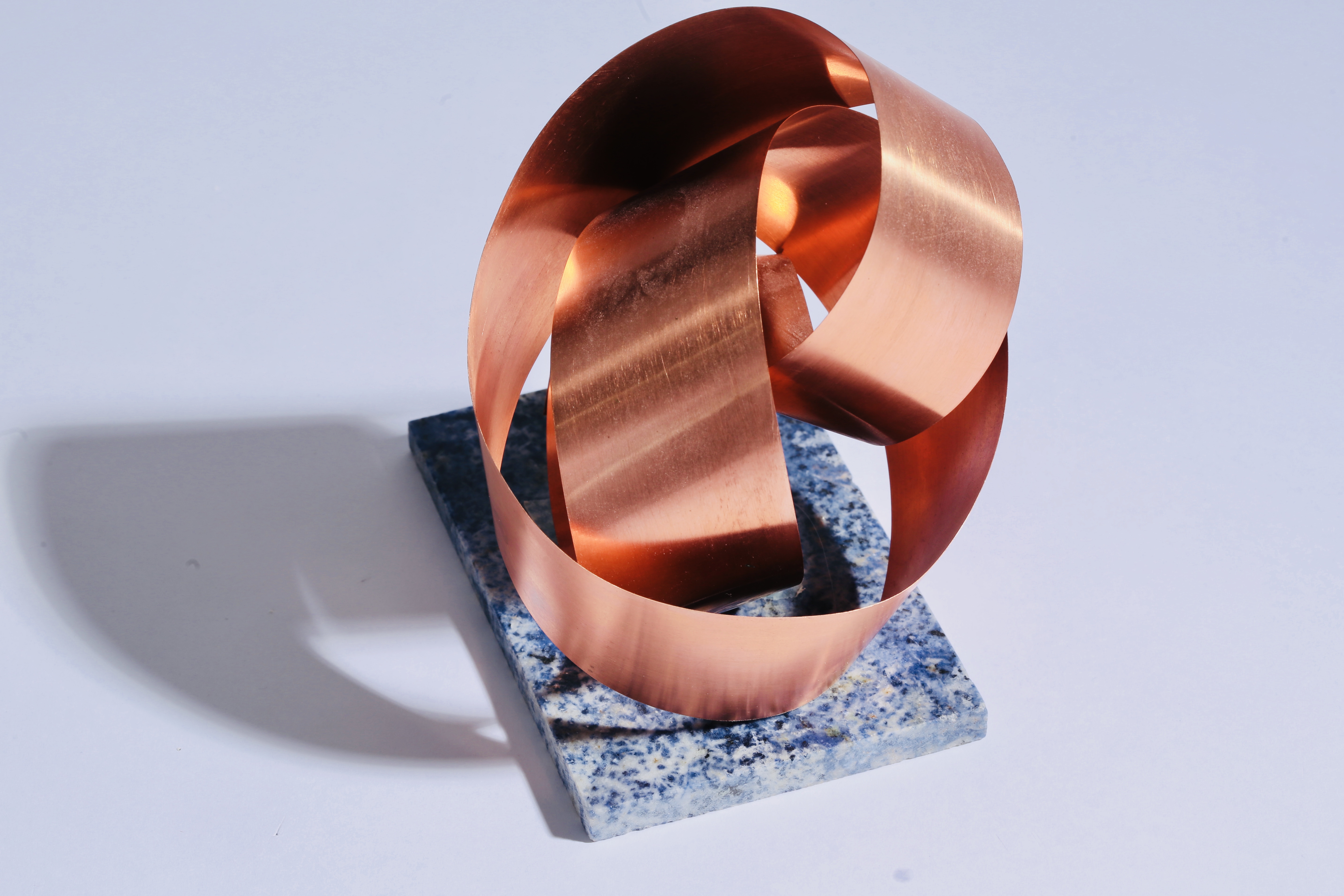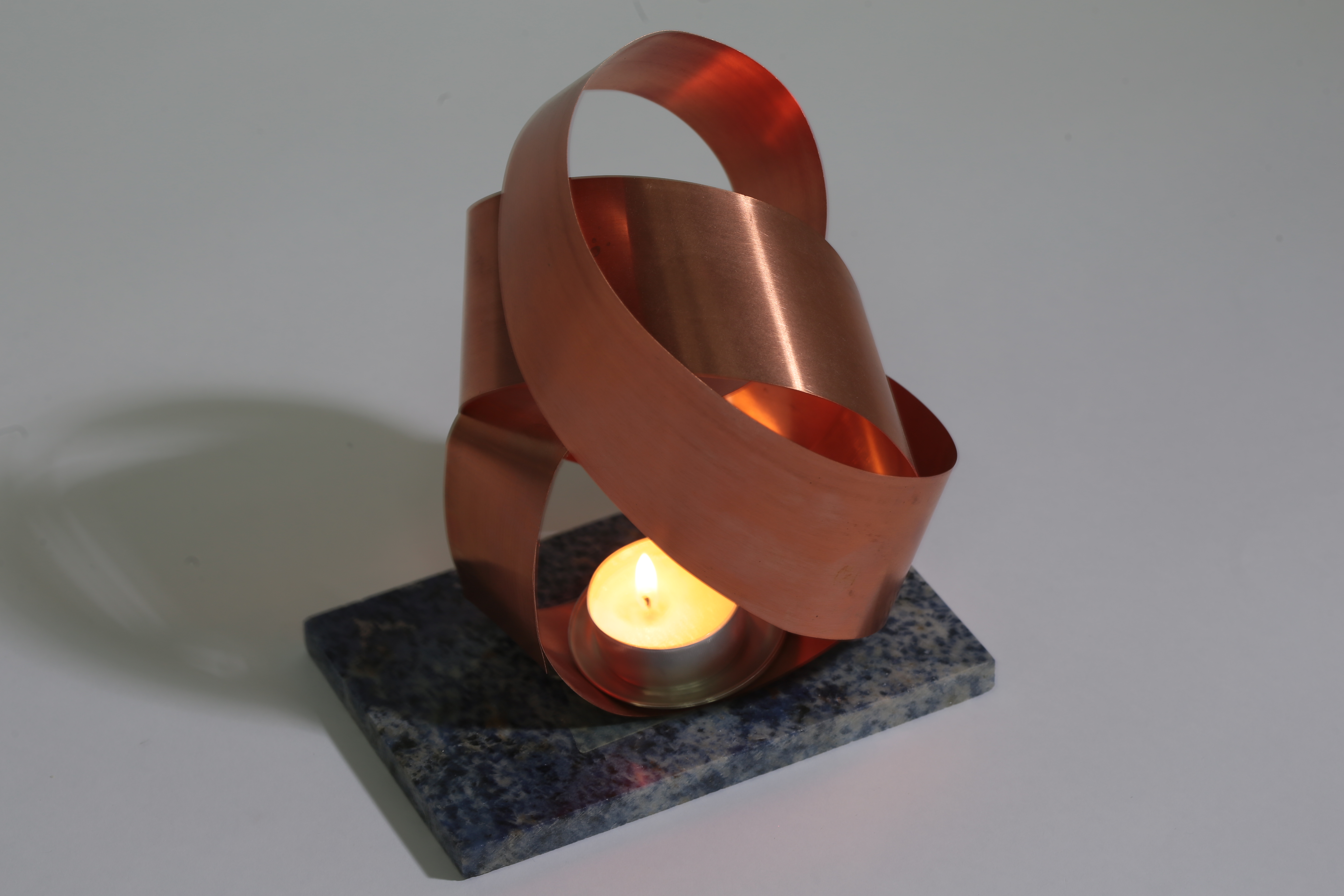 Double twist candle holder with infinite surface, can be used as a memorial. The candle sits on a removable sterling silver dish.