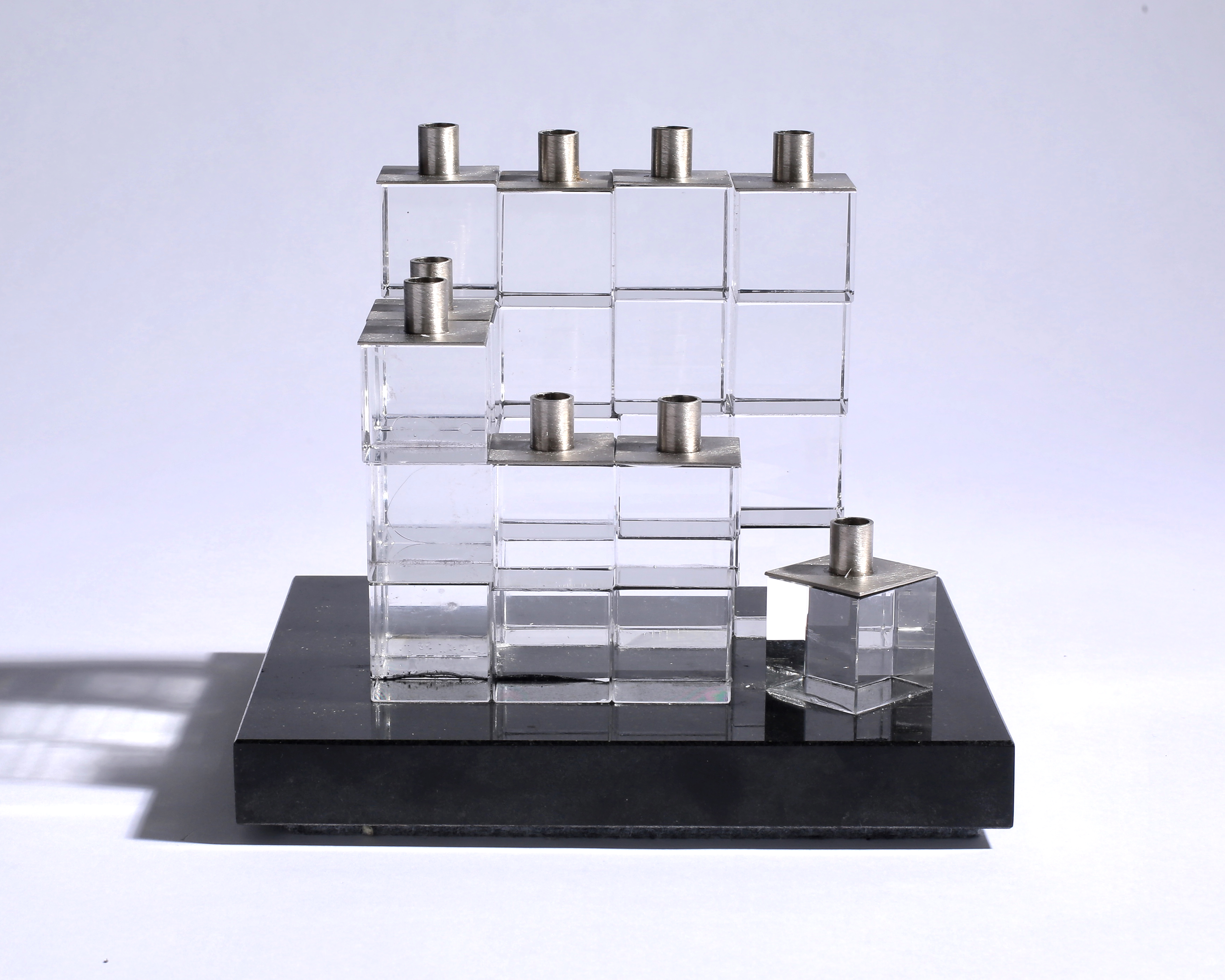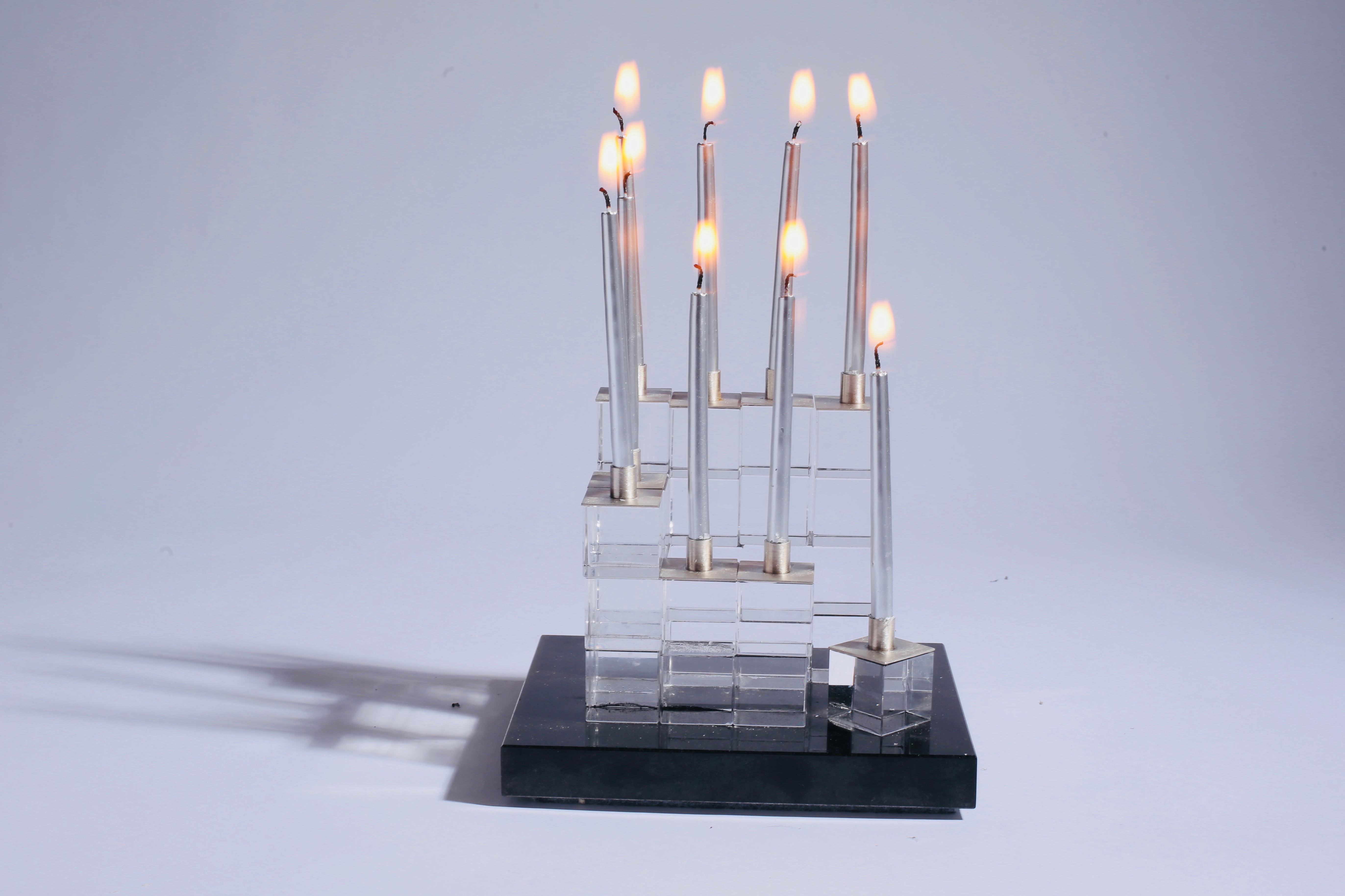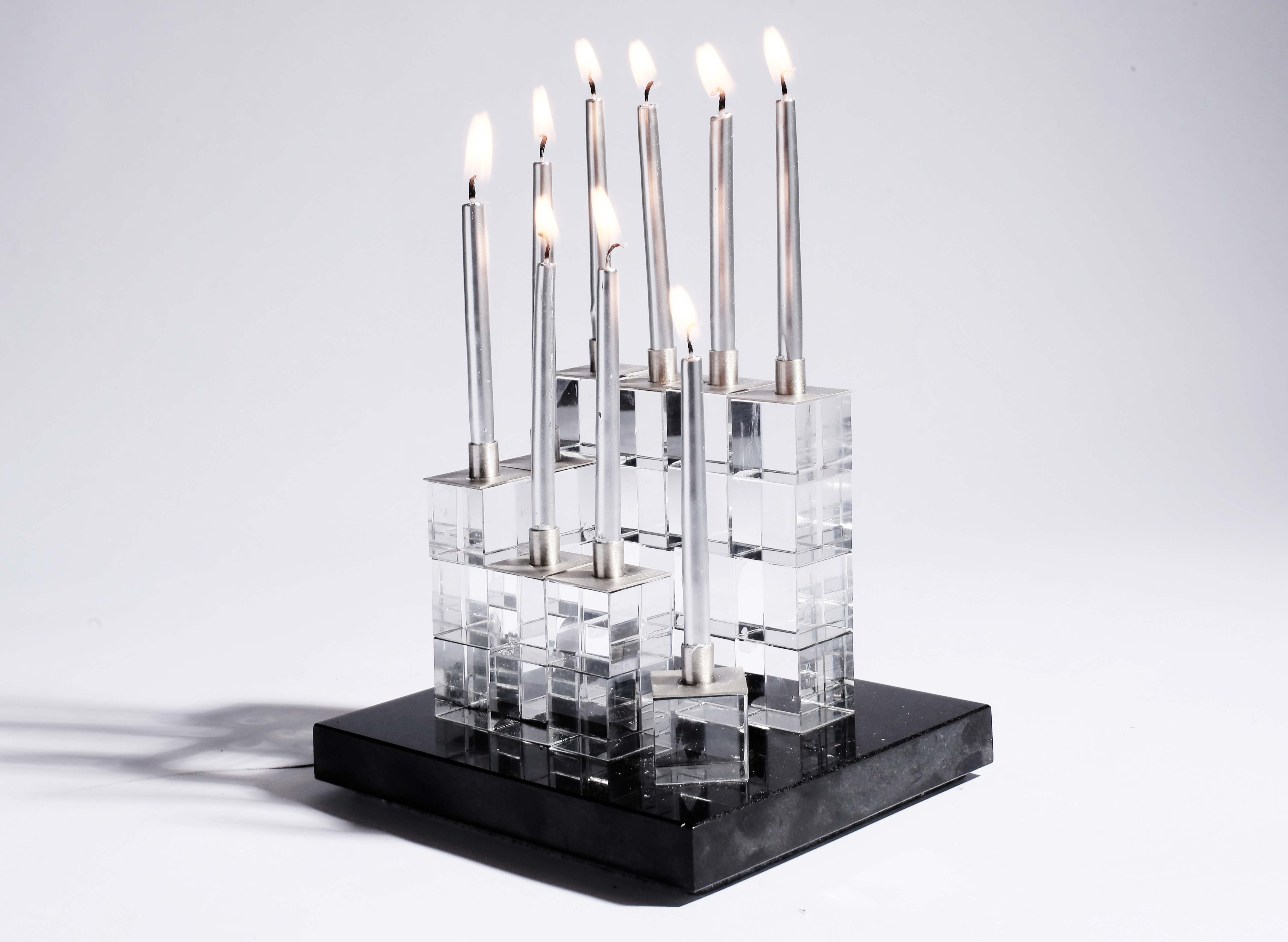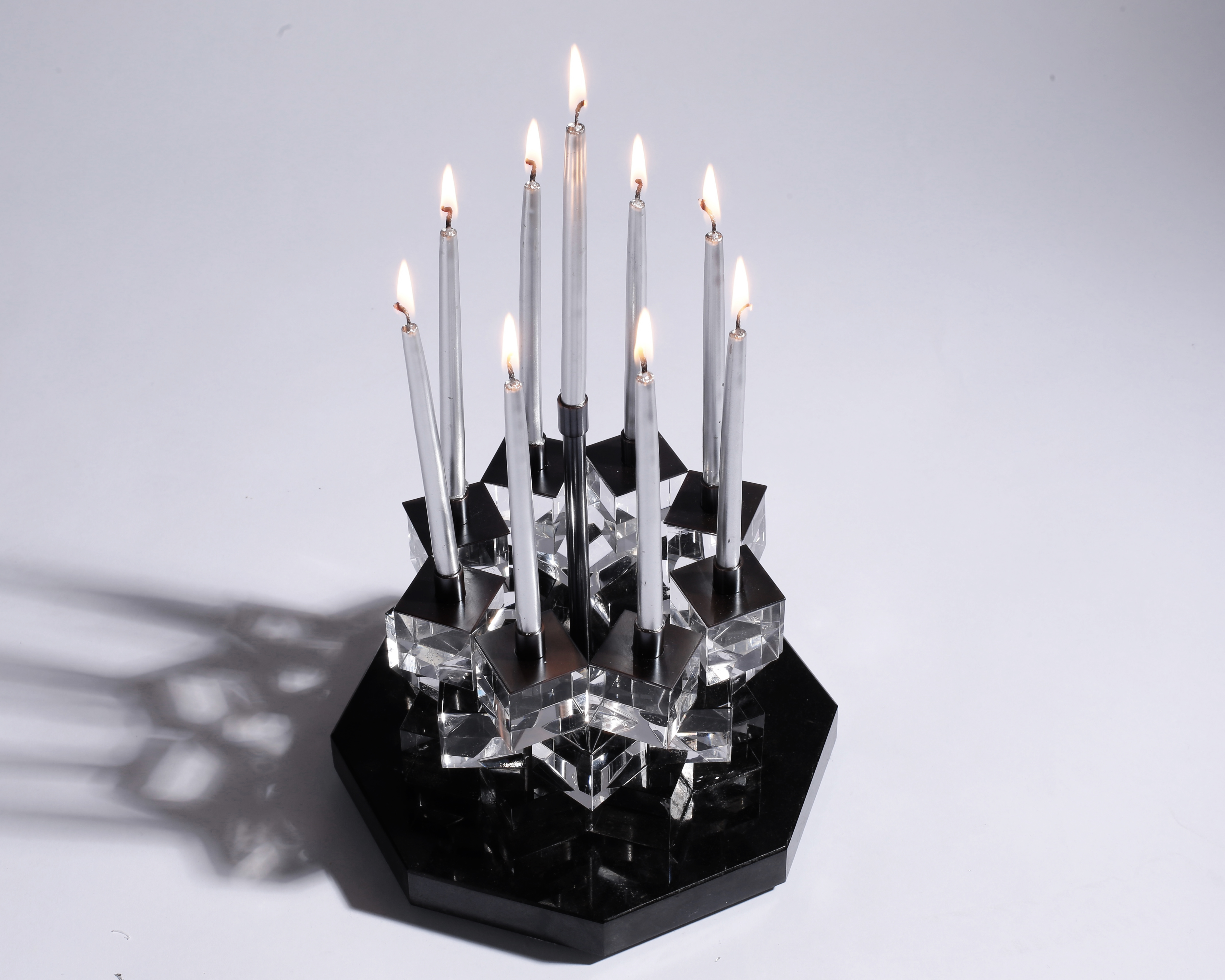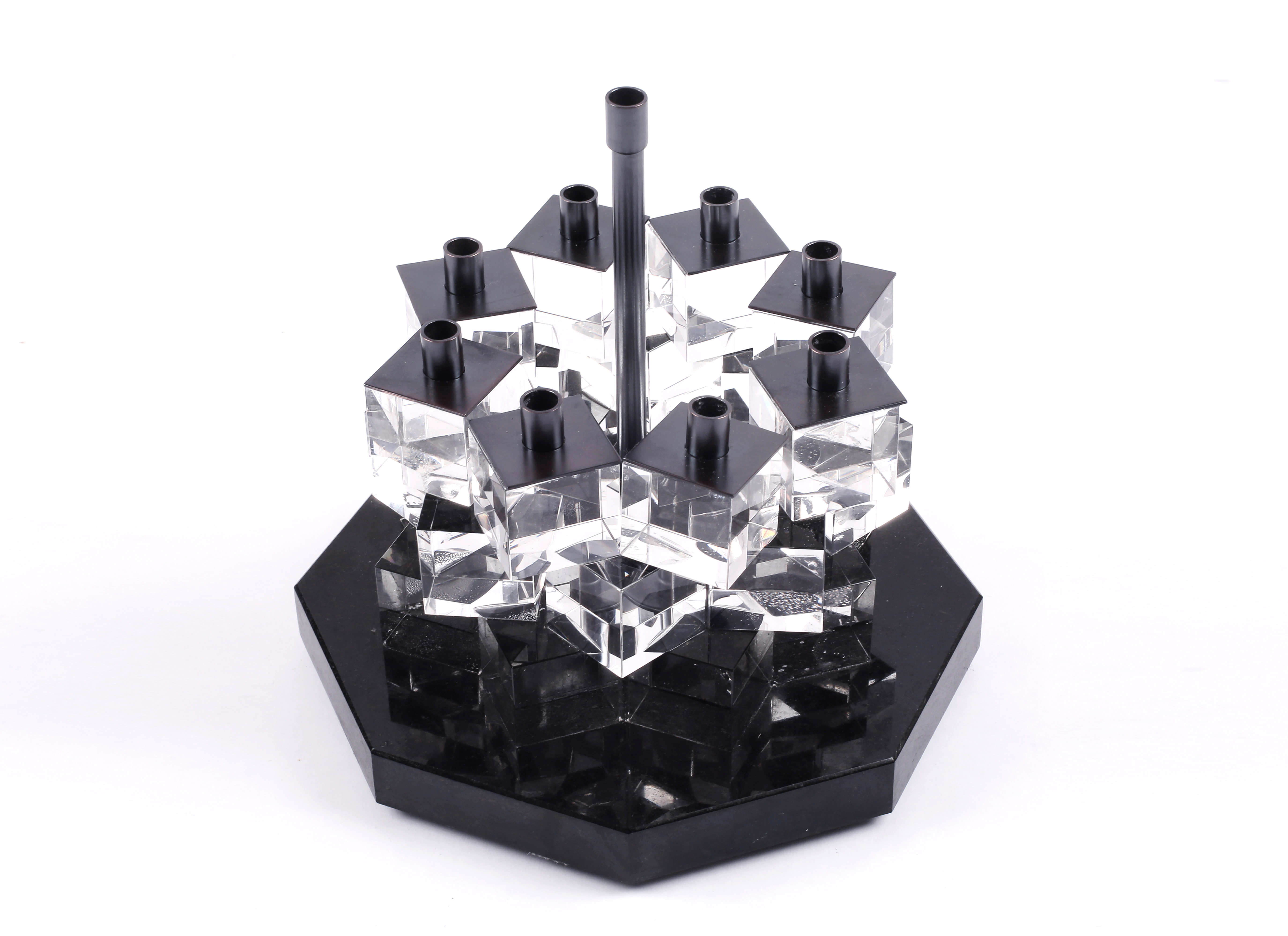 Polished crystal blocks bonded to a Nero Assoluto granite base with gun metal candle holders.The shamesh detaches for illumination.