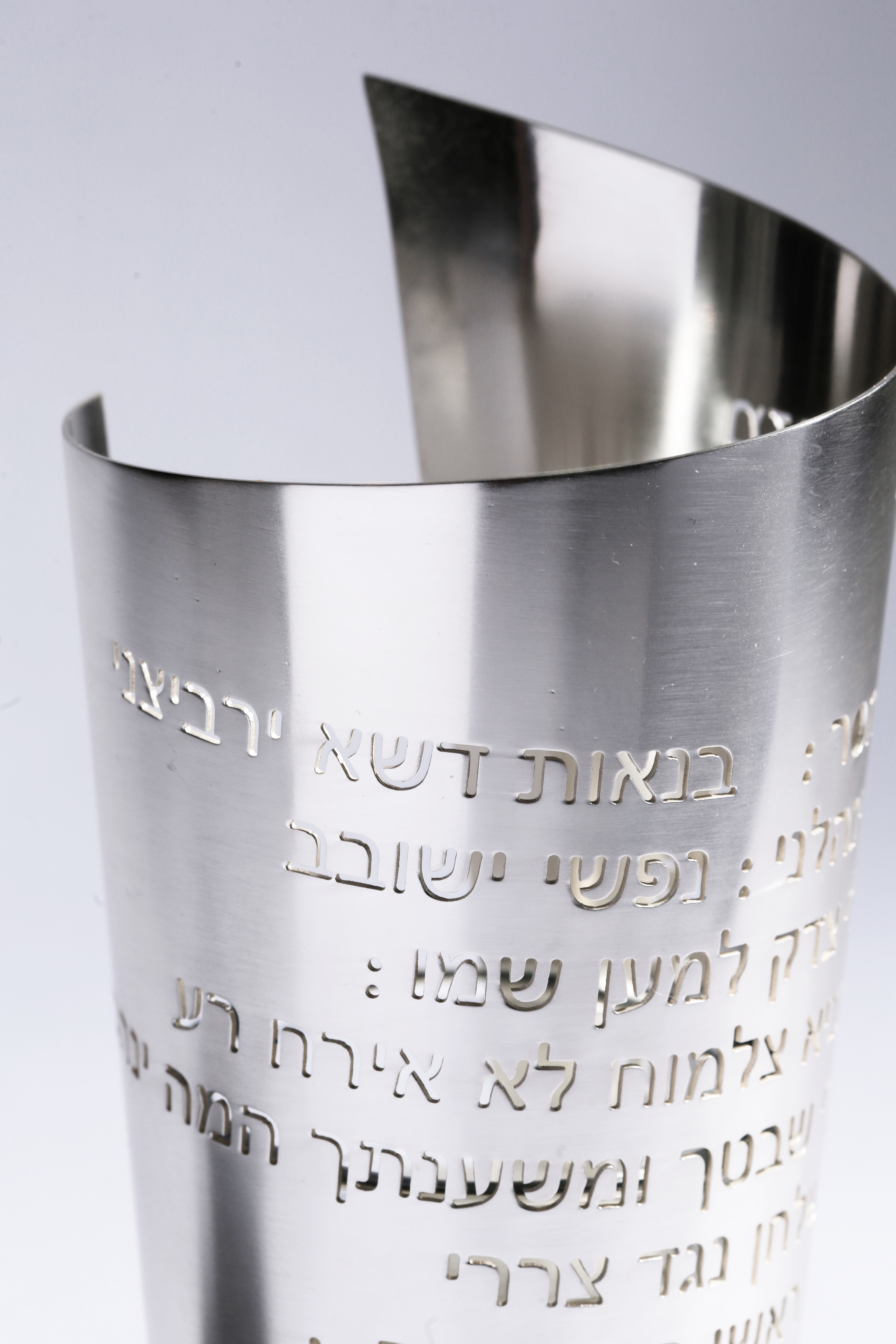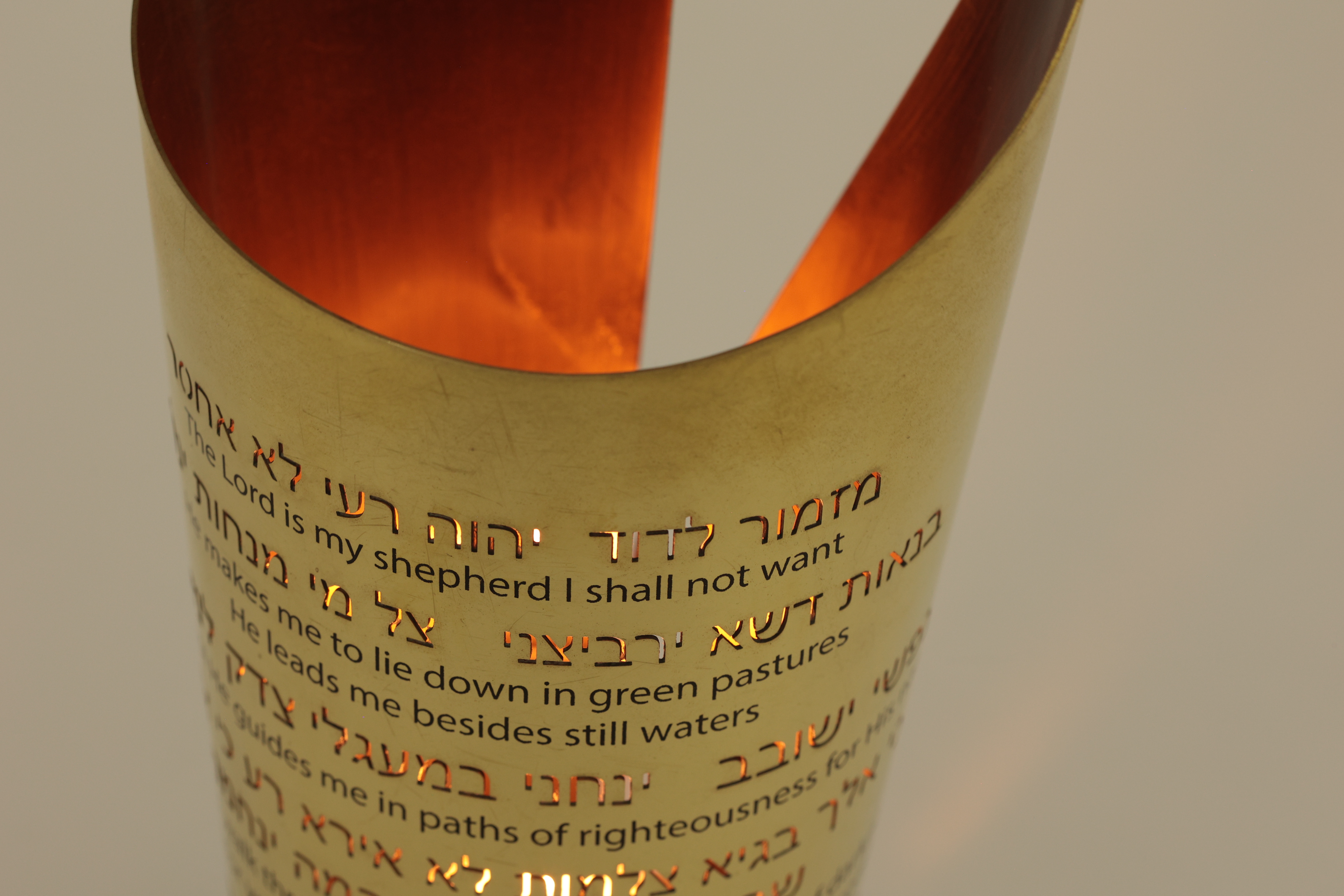 Silver plated sheet representing a flame is incised with Psalm 23 and stands on a Moonlight granite base. Candle light glows through the inscription. The conical element detaches from the base when required. A deep Carrara Gris base was also made for this item. The candle sits in a glass holder.