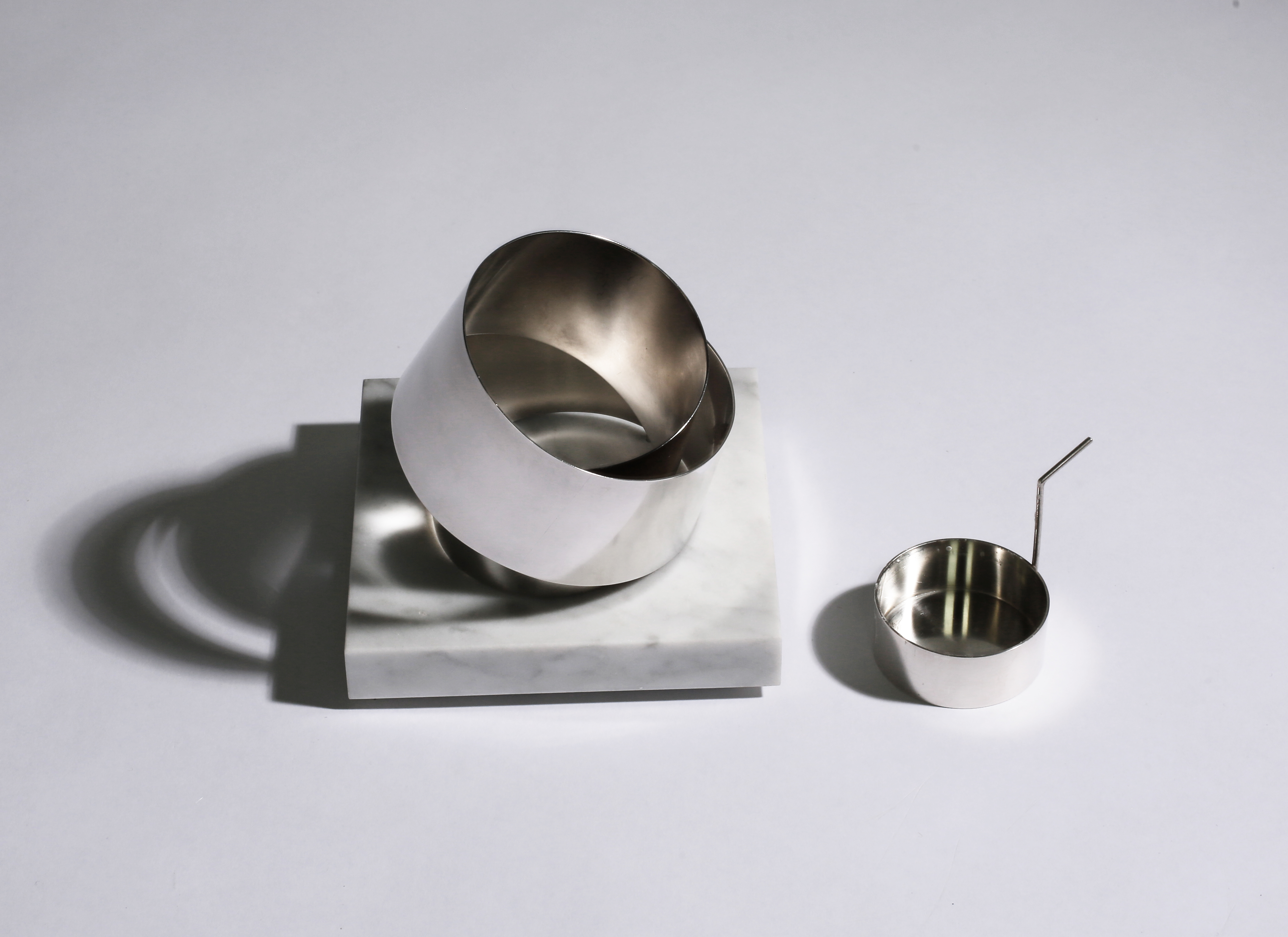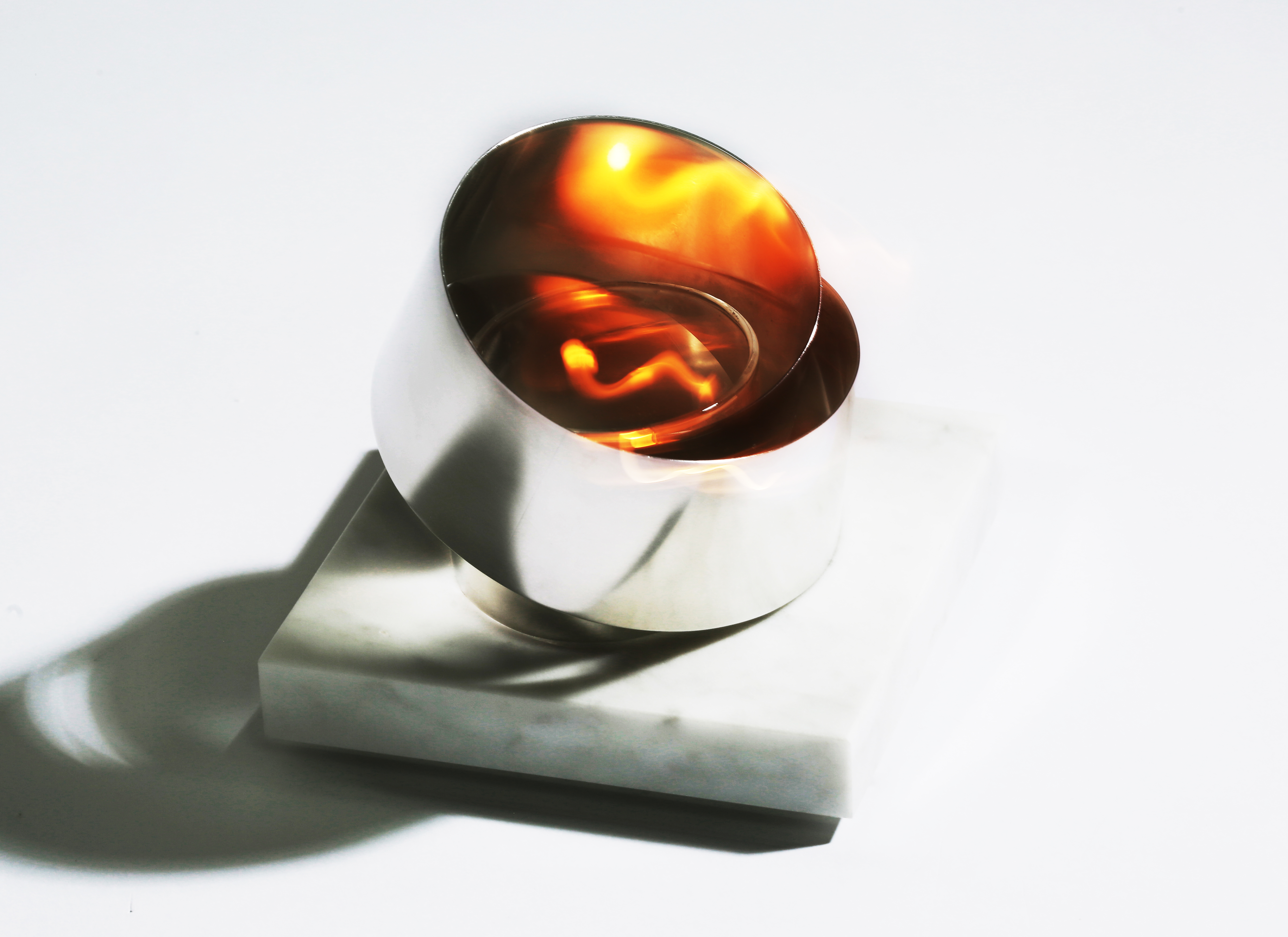 Solid silver (hall marked 925 silver) candle holder. A continuous surface of precious metal mounted on a white marble base. representing the unending nature of our memories. Silver candle pan included.