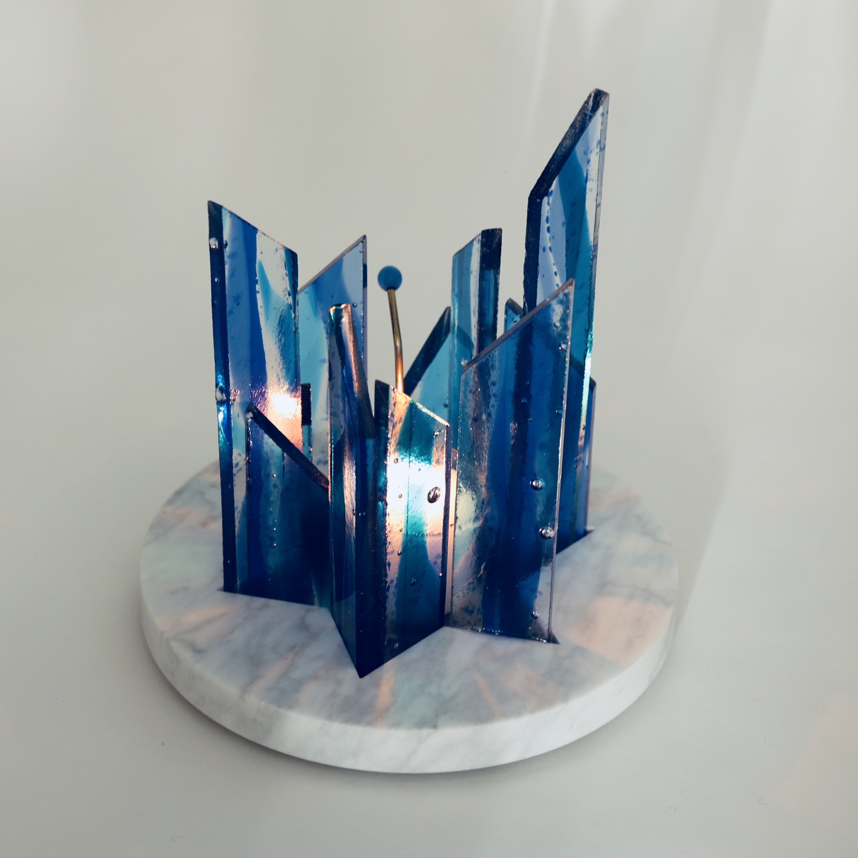 Hand made shards of fused glass in traditional colours are fitted to a Carrara marble and stainless steel base. Candle light reflects and glows in the structure.