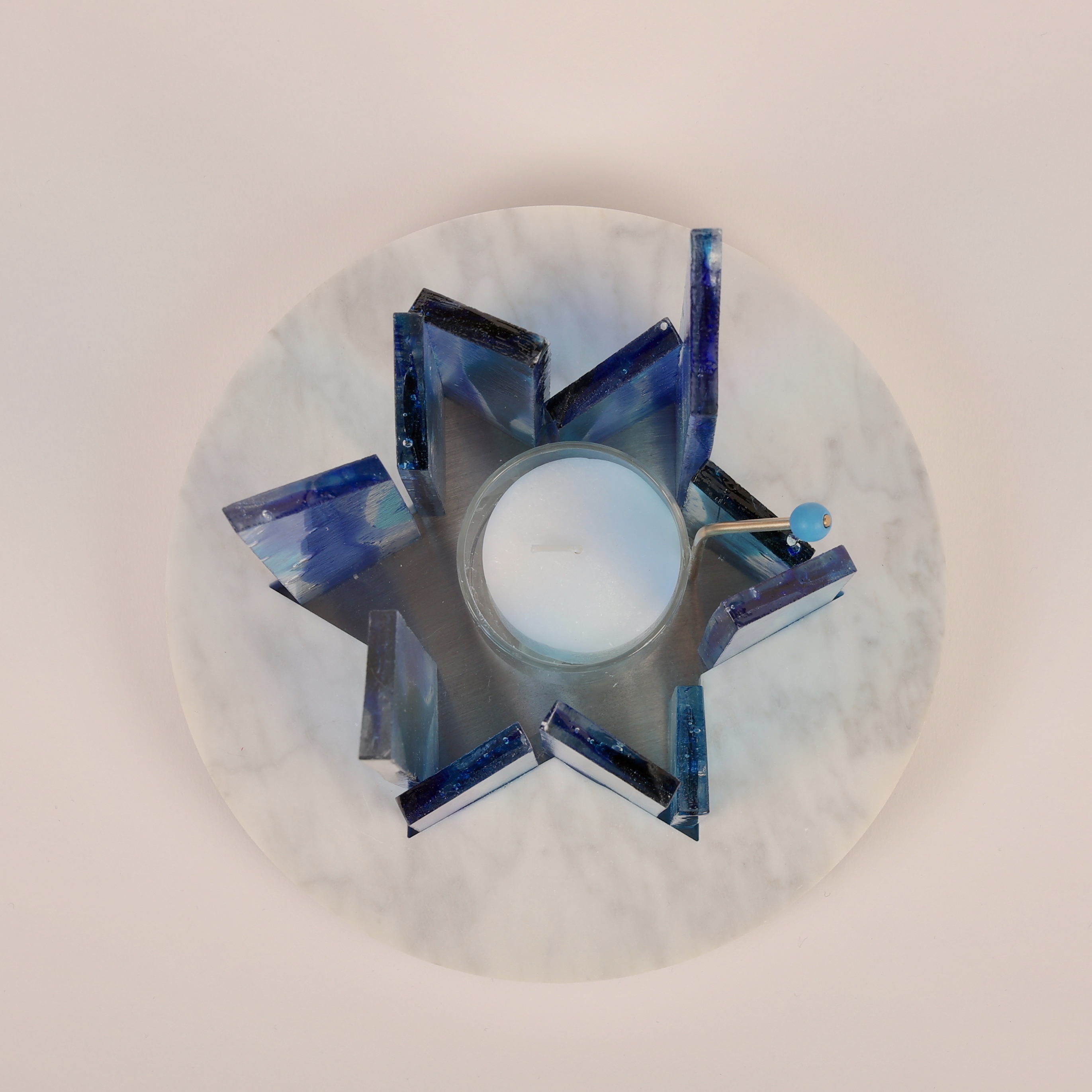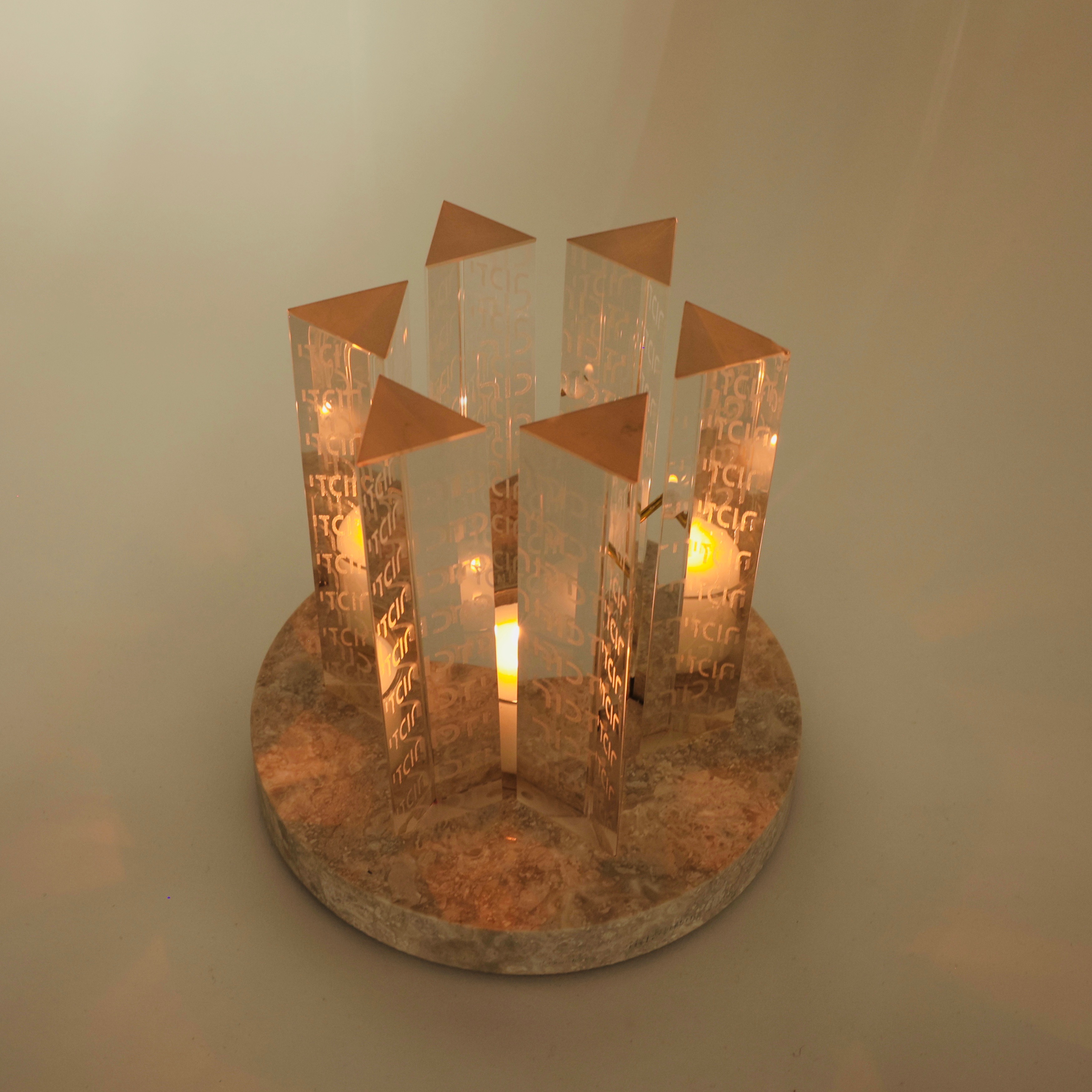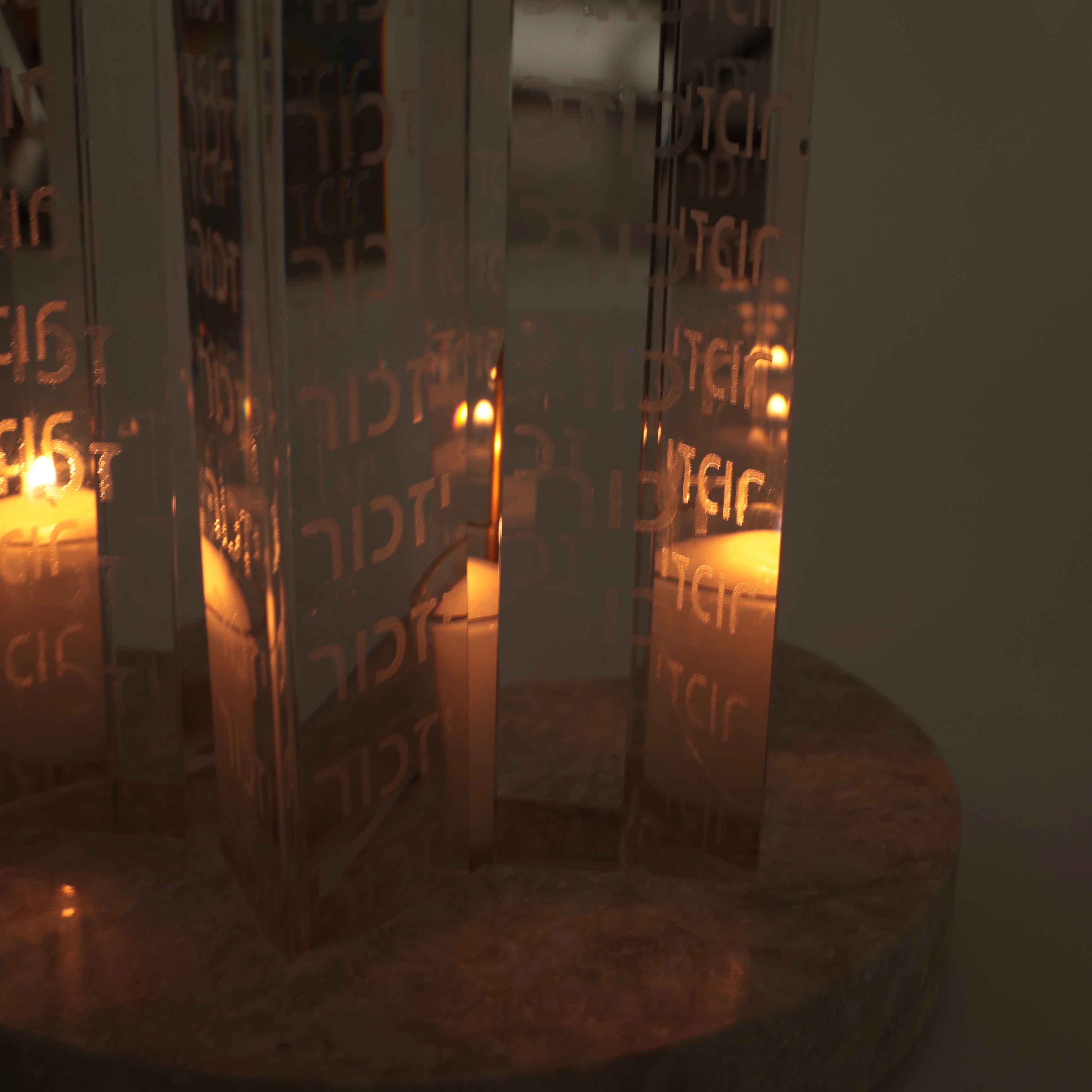 Engraved crystal prisms bonded to Veridian marble base. Yizkor is engraved in Hebrew script on the large prisms and is reflected through the structure. Candle light is enhanced.