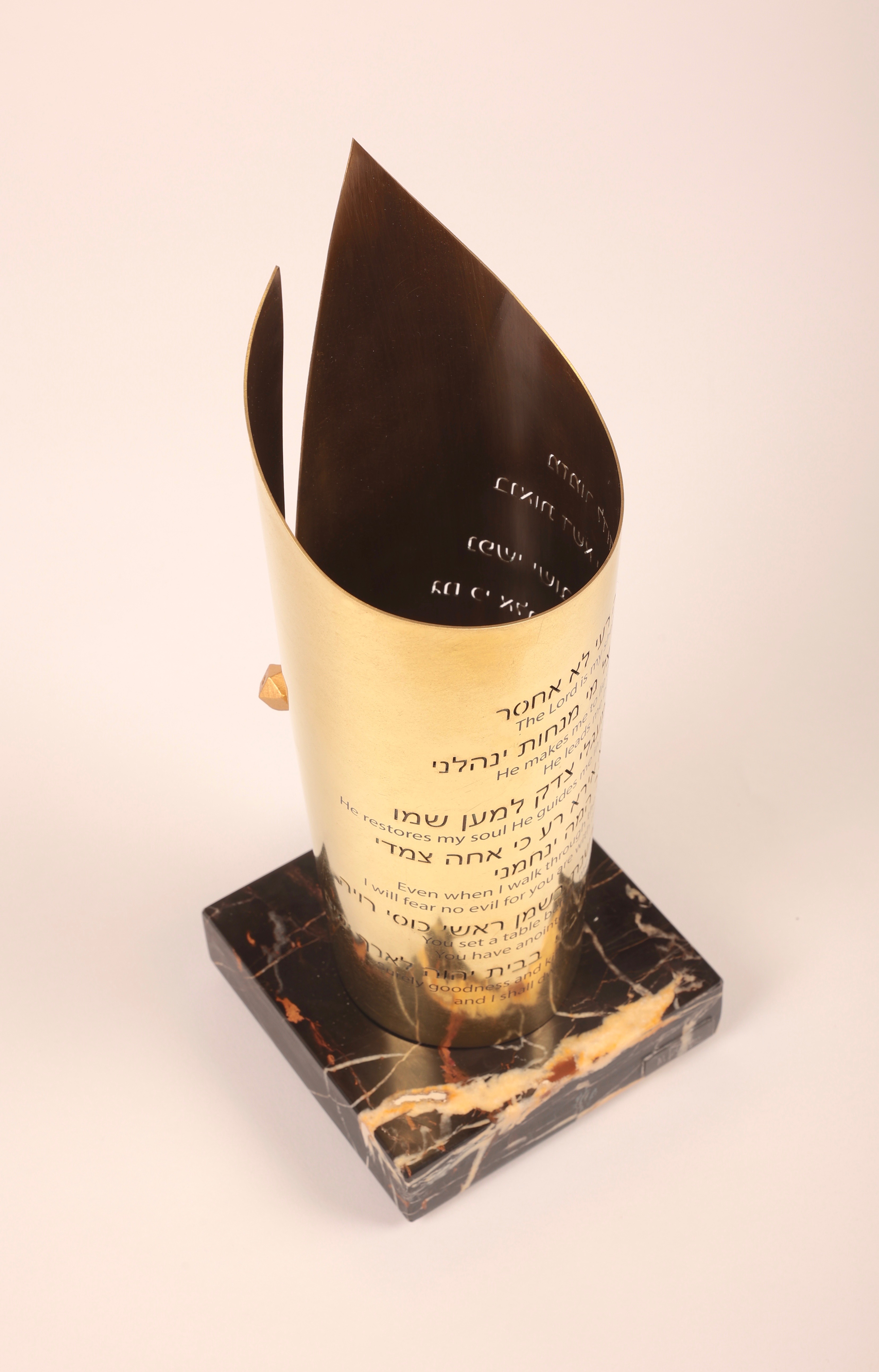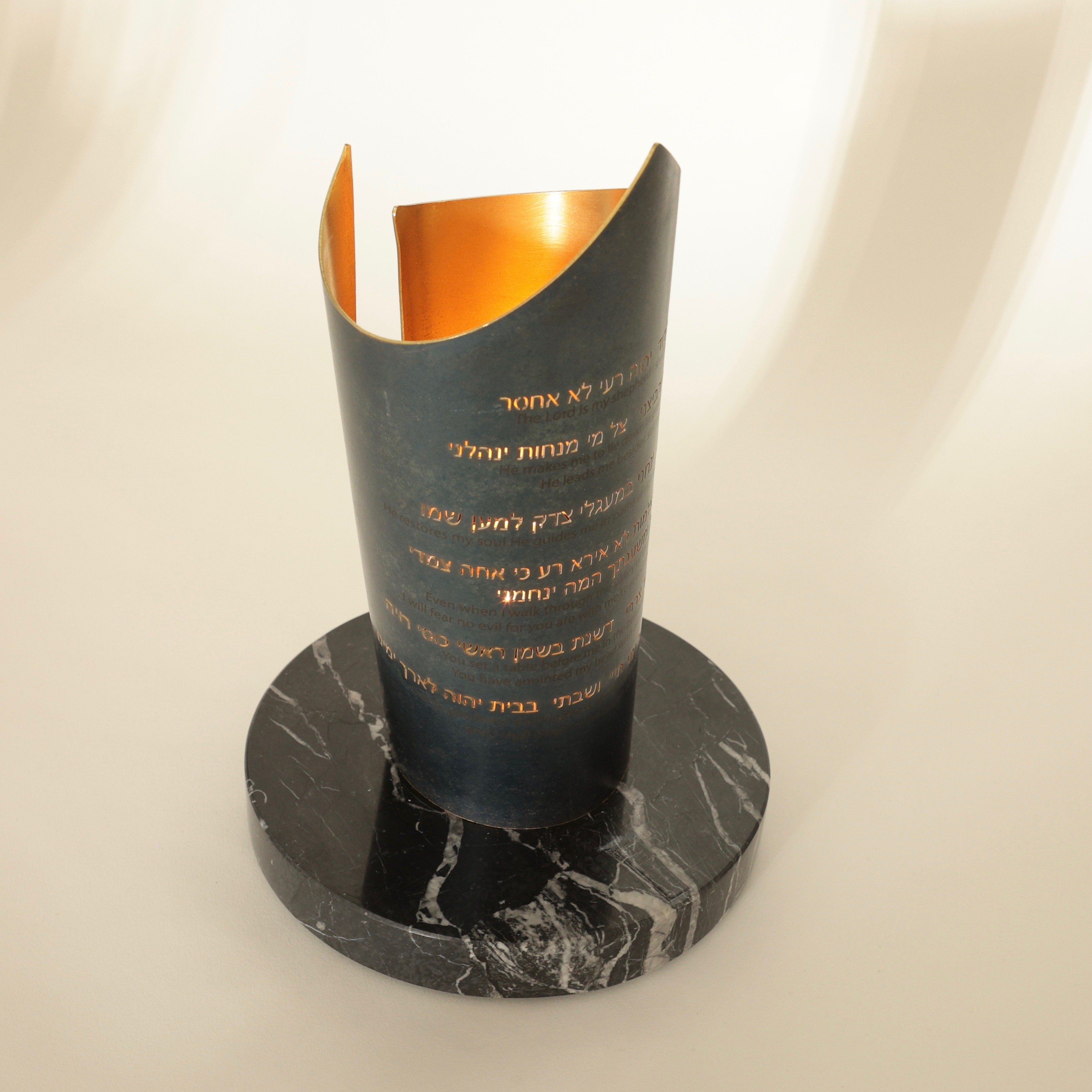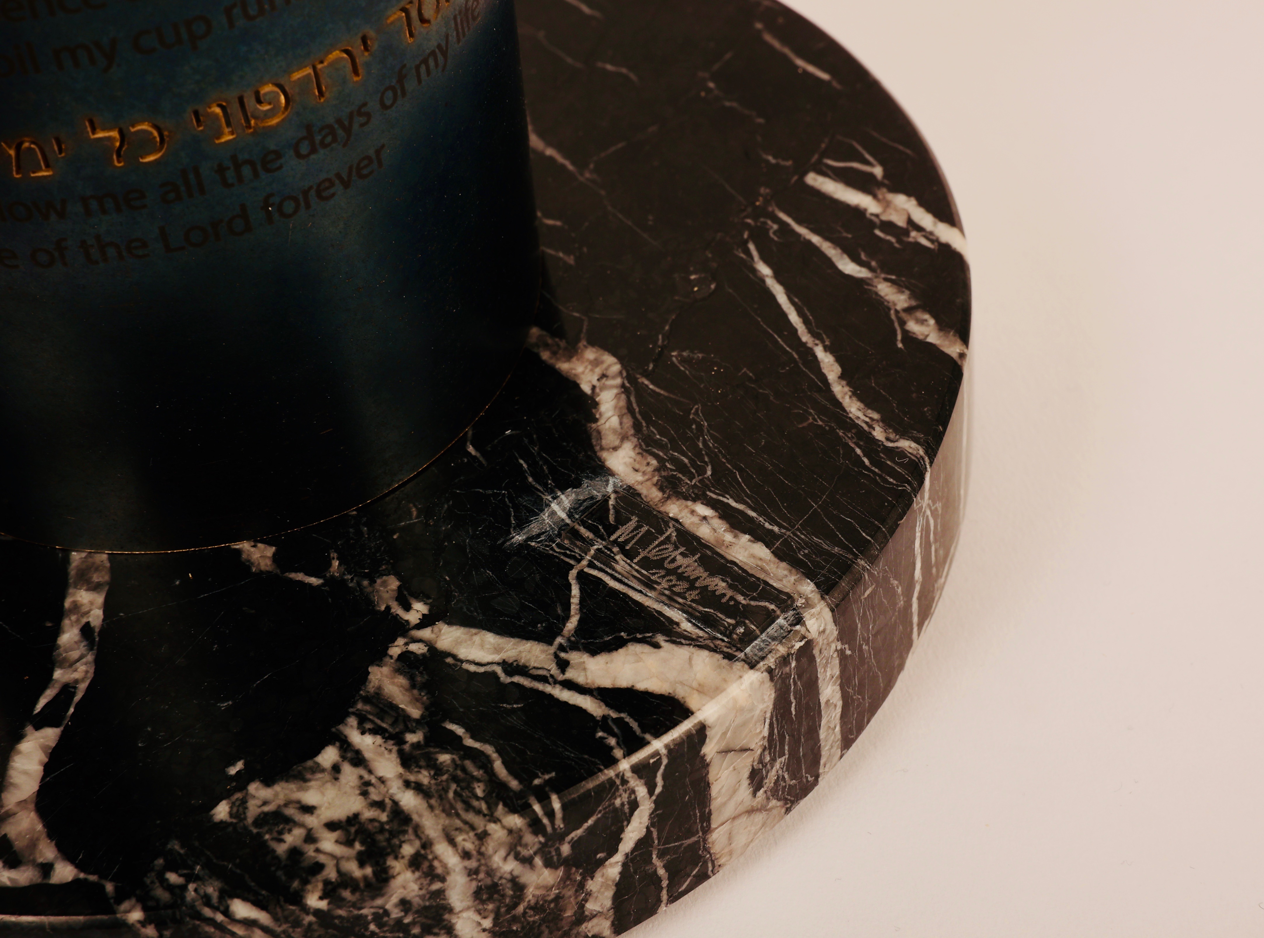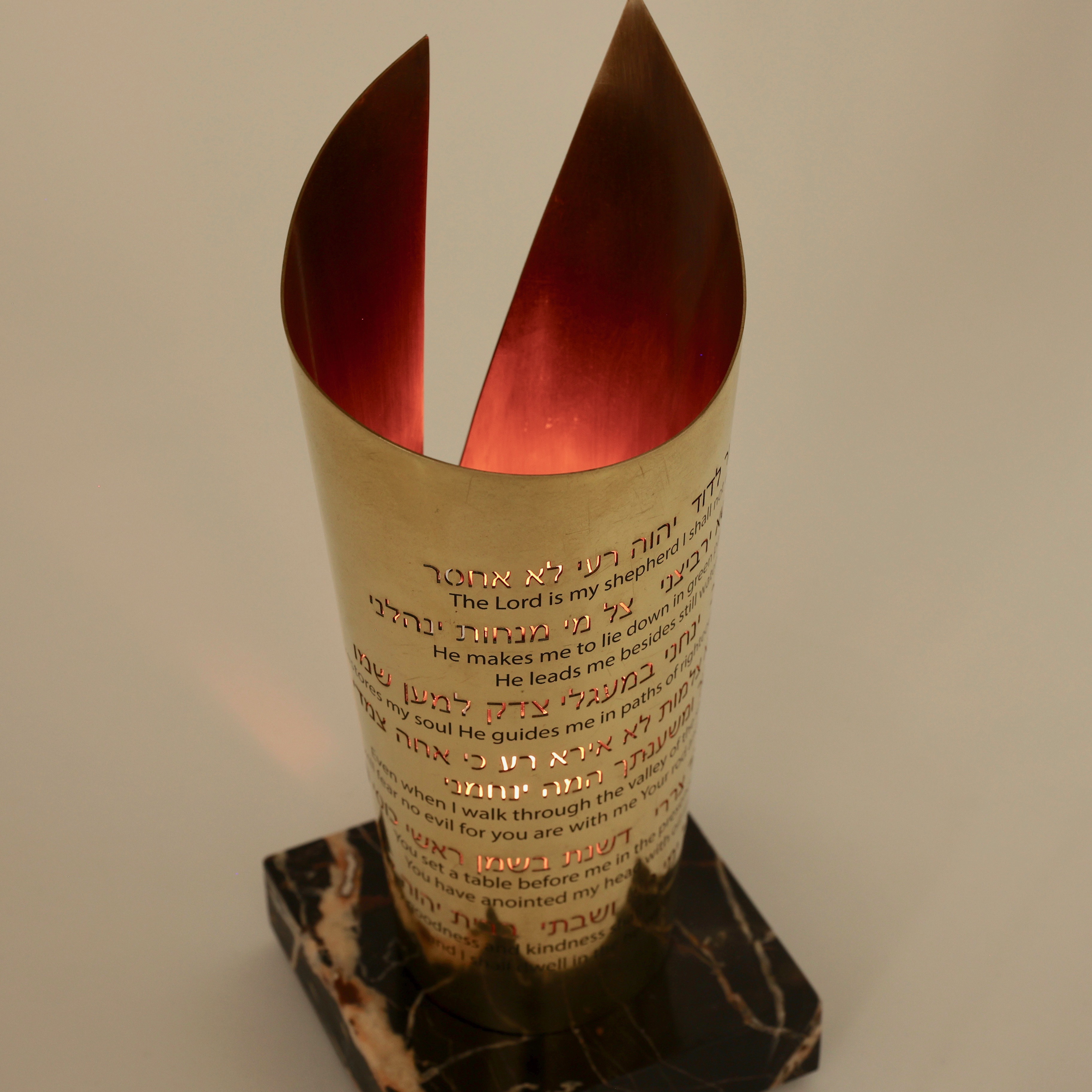 The uniquely patinated brass flame is pierced with Psalm 23 which also has an engraved English translation. The candle light glows through the piercing and is reflected in the hand polished interior. The flame sits on a polished Nero Marquina marble base.