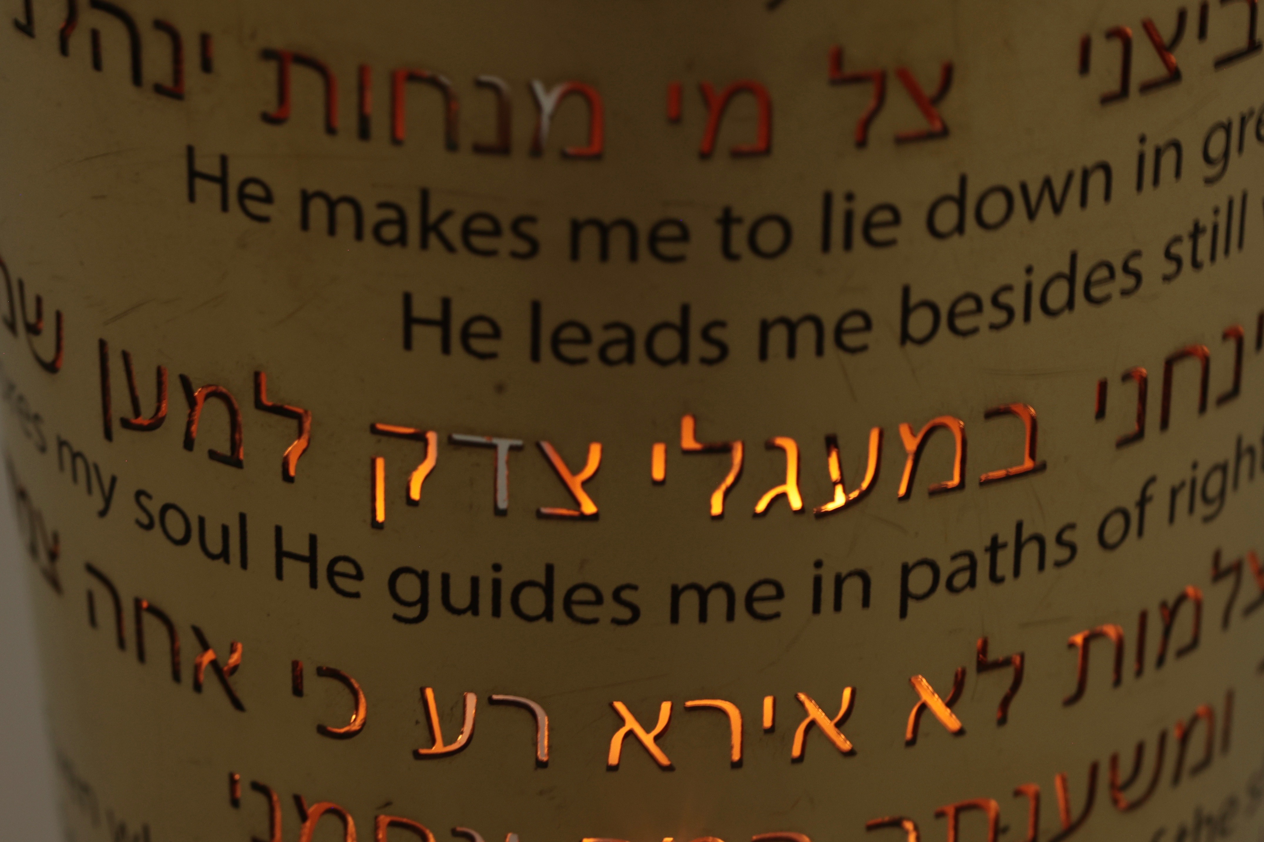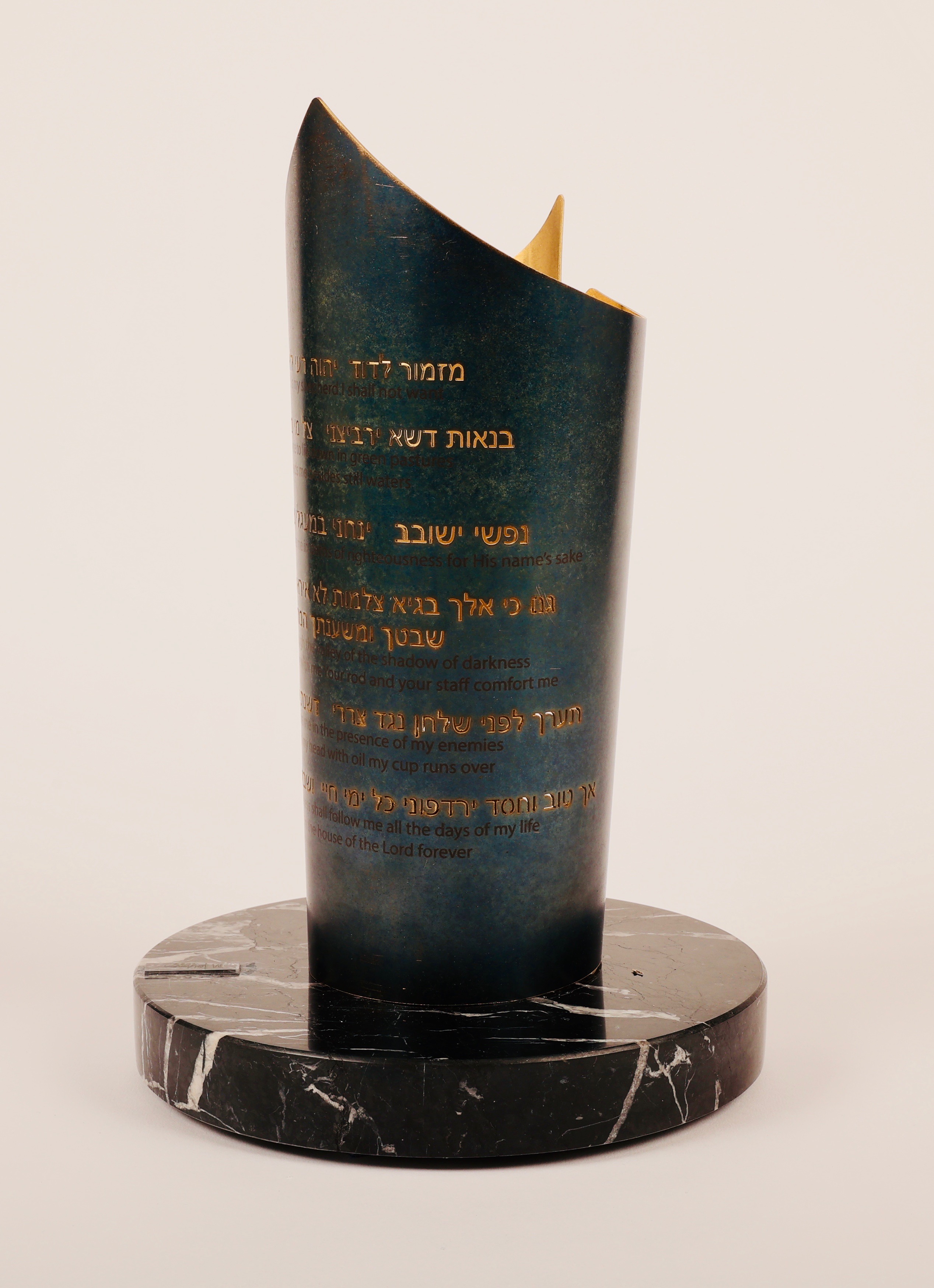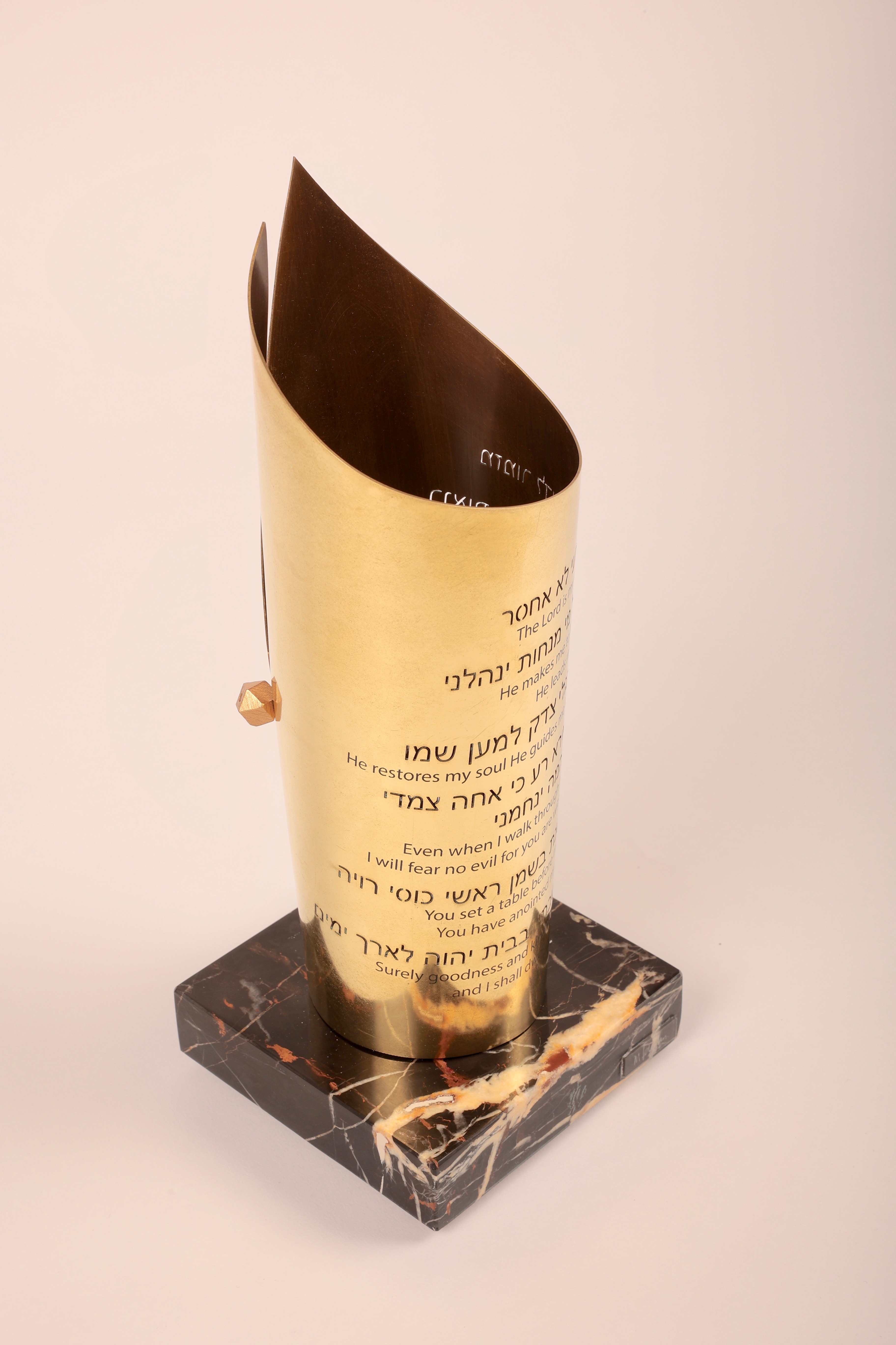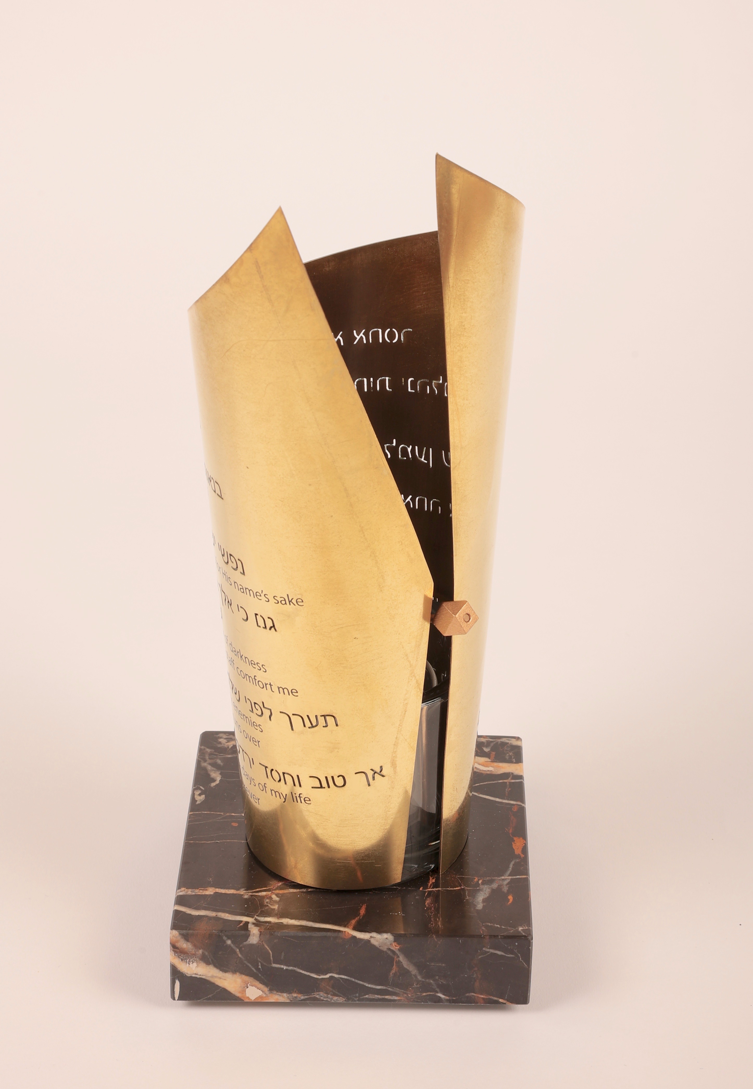 The uniquely patinated brass flame is pierced with Psalm 23 which also has an engraved English translation. The candle light glows through the piercing and is reflected in the hand polished interior. The flame sits on a polished Nero Marquina marble base.