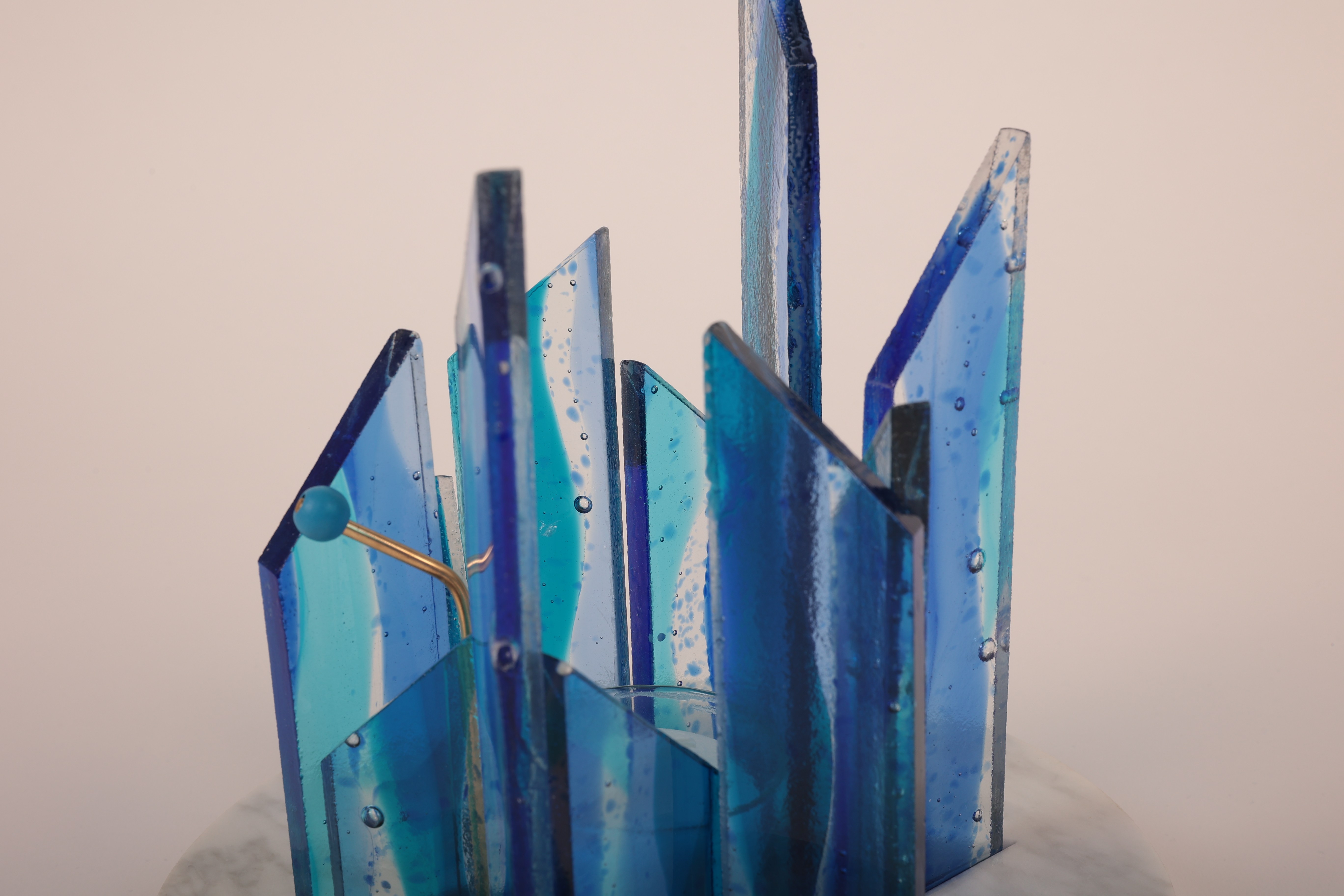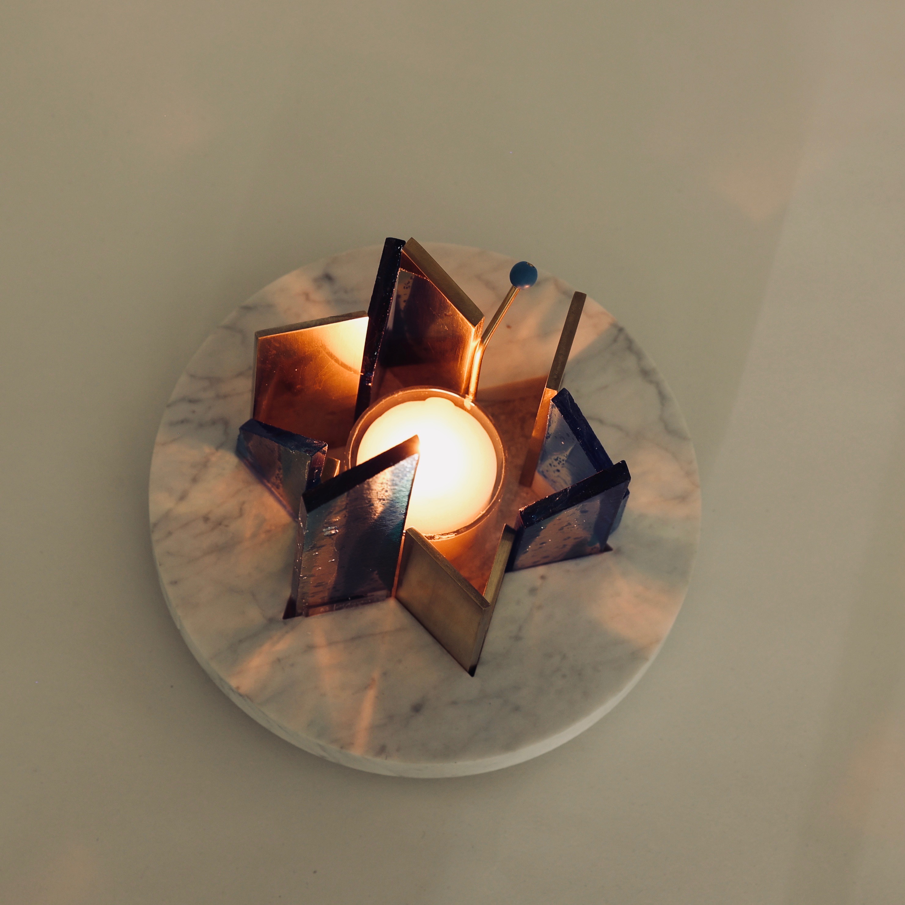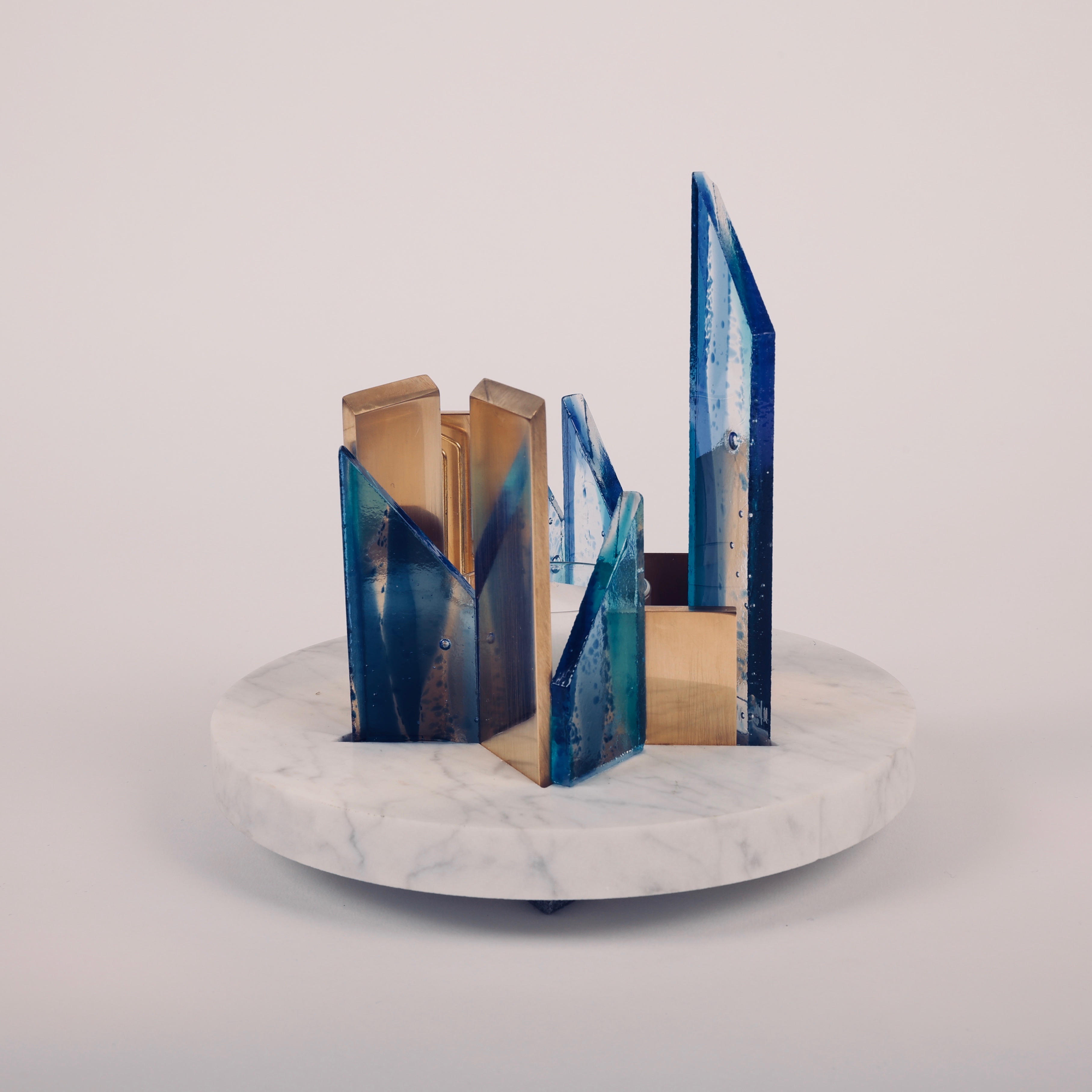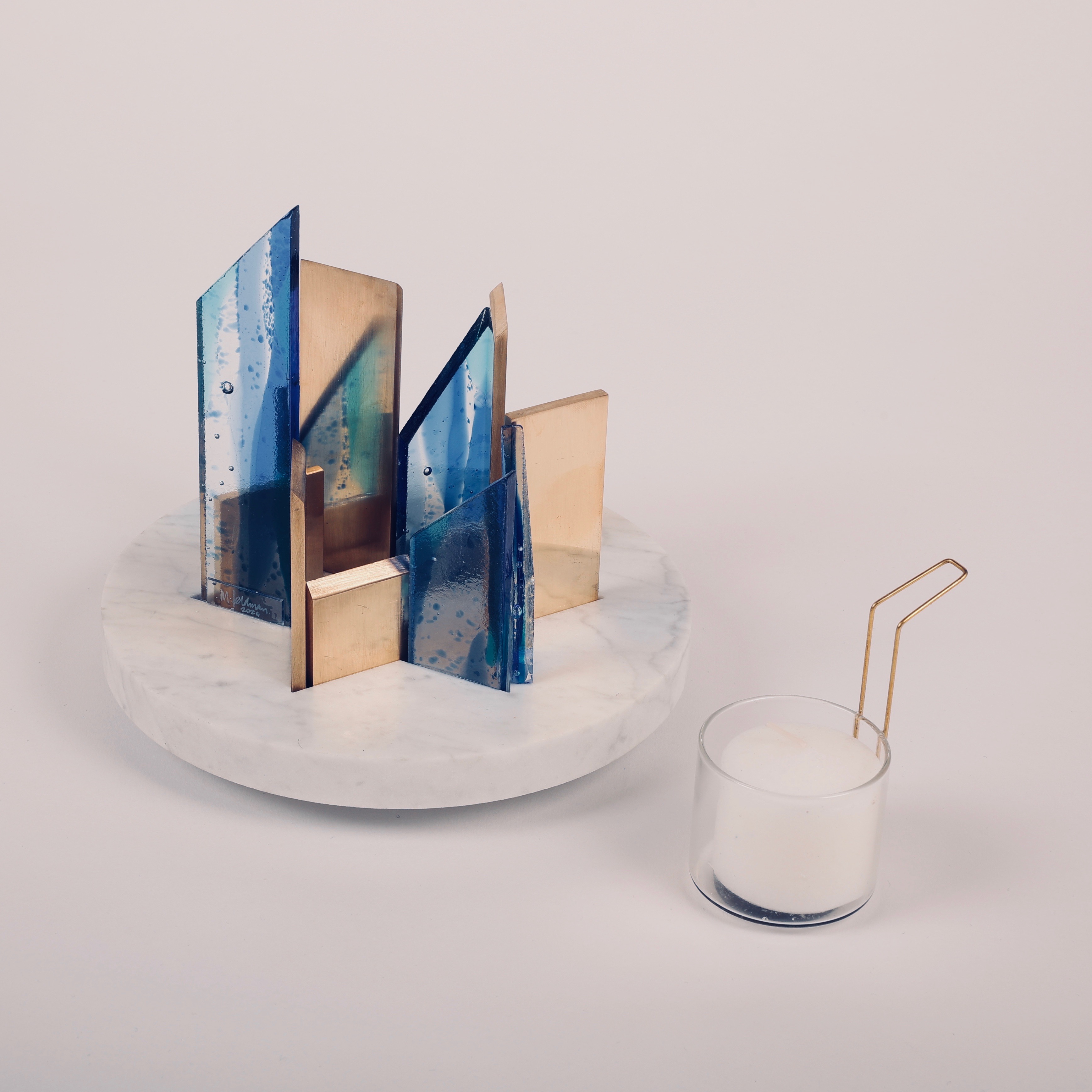 A new variation on the Glass Shard design incorporating polished brass metallic elements for a different vibrancy and reflections. The candle is housed in a glass pan for ease of use. The base is polished Carrara.