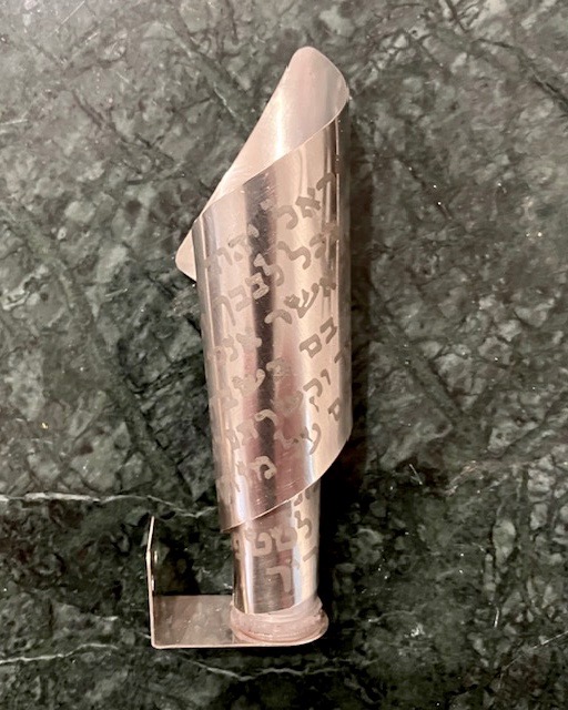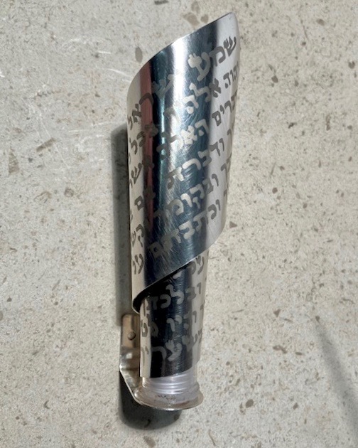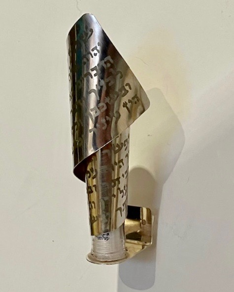 The body of the outer casing represents the prayer parchment that has floated on the breeze to land on the doorpost. The kosher k’laf is contained in the integral glass capsule and the piece simply fixes via a silver bracket. Stirling silver and glass. Recommended for interior. Alternative materials for exterior use