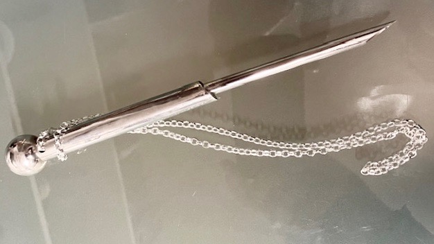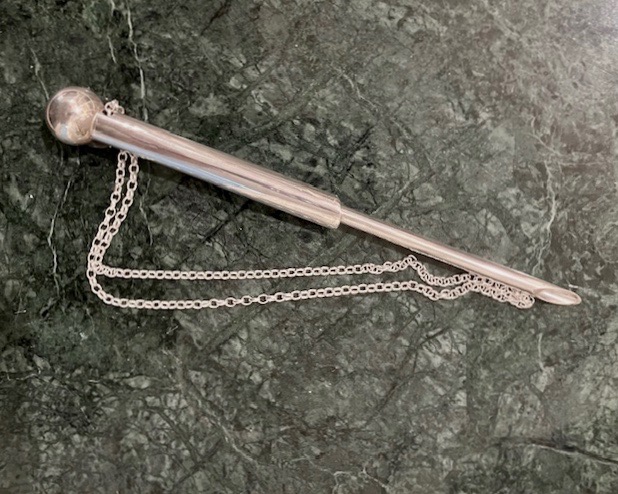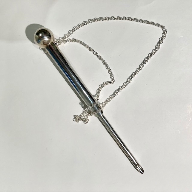 A simple polished silver Yad pointer and chain in a minimalist design to be used as a respectful aid to reading. The inspiration of the design is the quill used by the scribe.